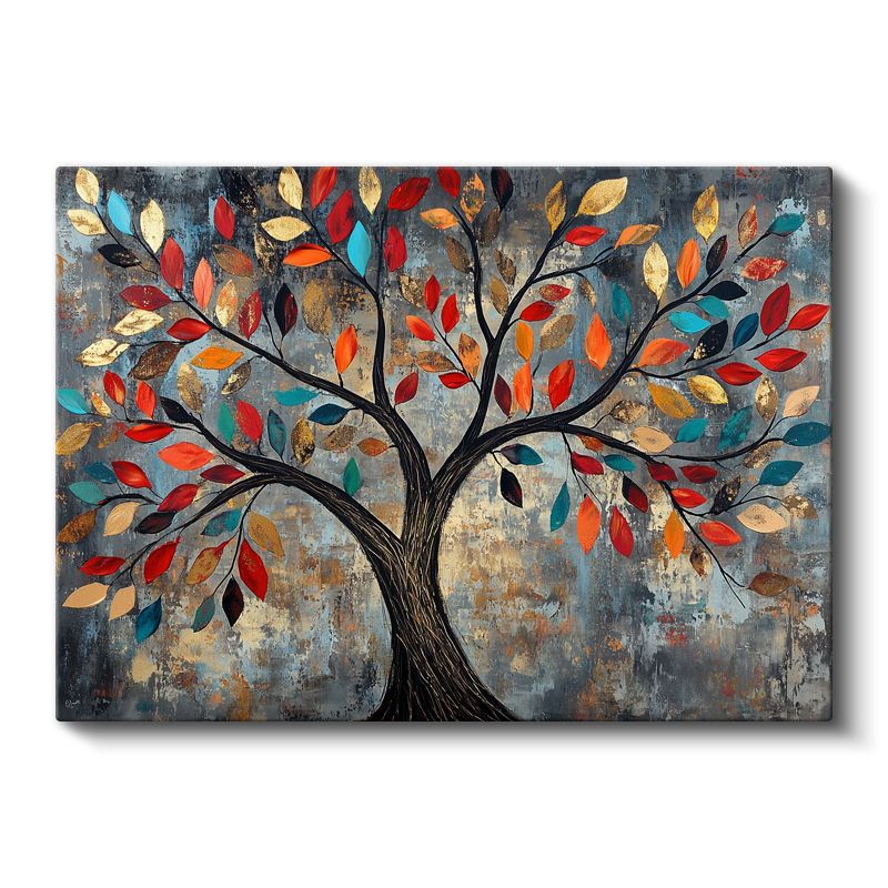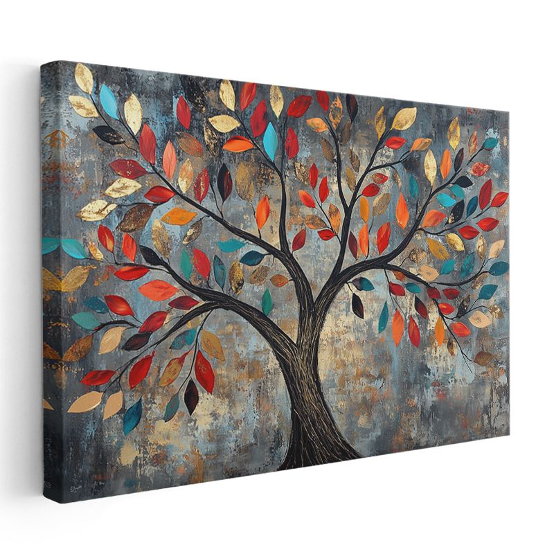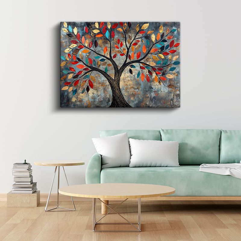 Renkli Yapraklı Ağaç - Gri Fonda Dekoratif Sanat Kanvas Tablo