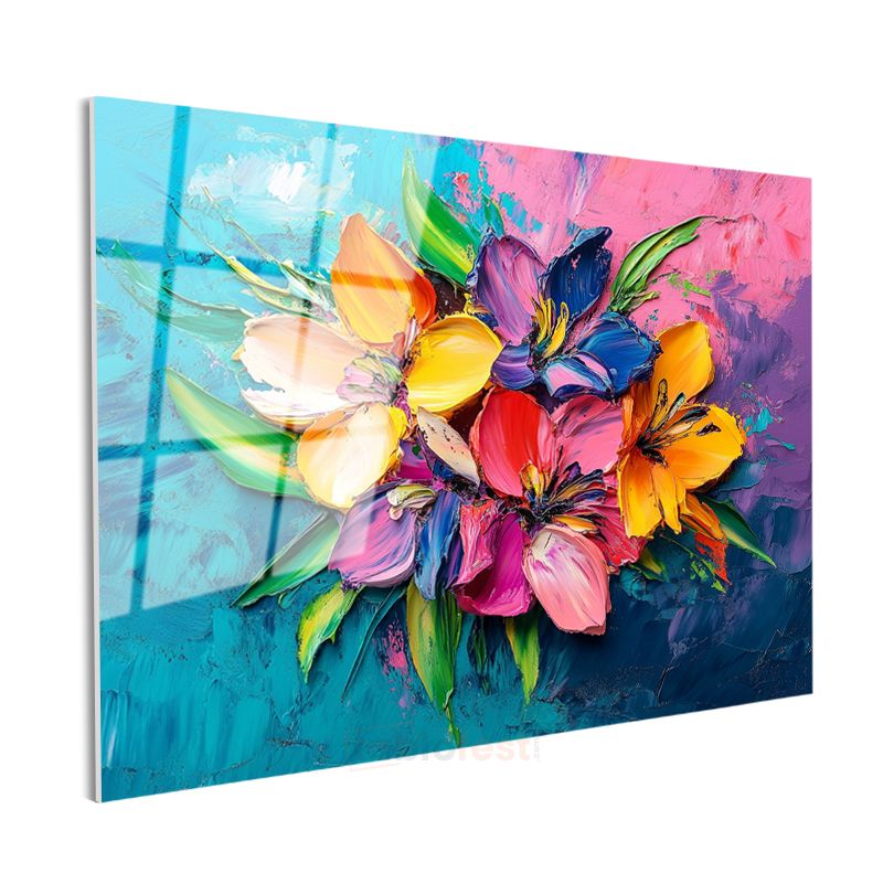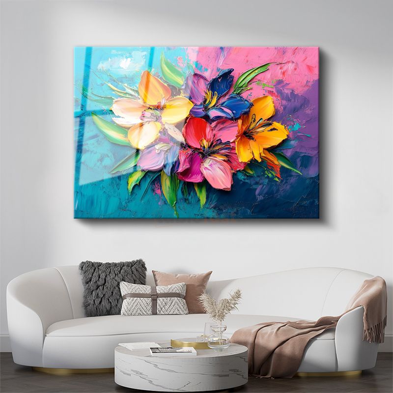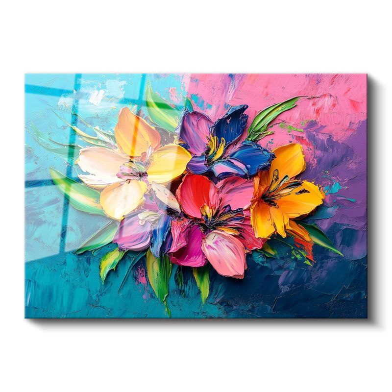 Renkli Zambaklar - Mavi Pembe Fonda Canlı Buket Cam Tablo