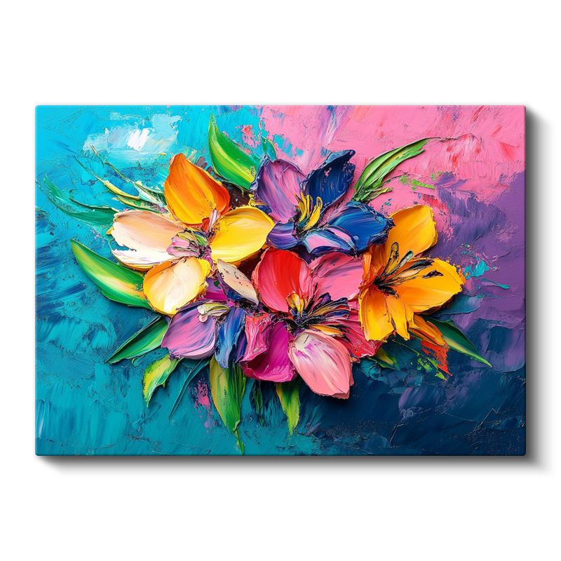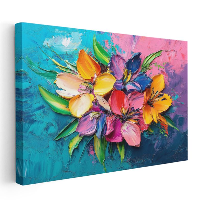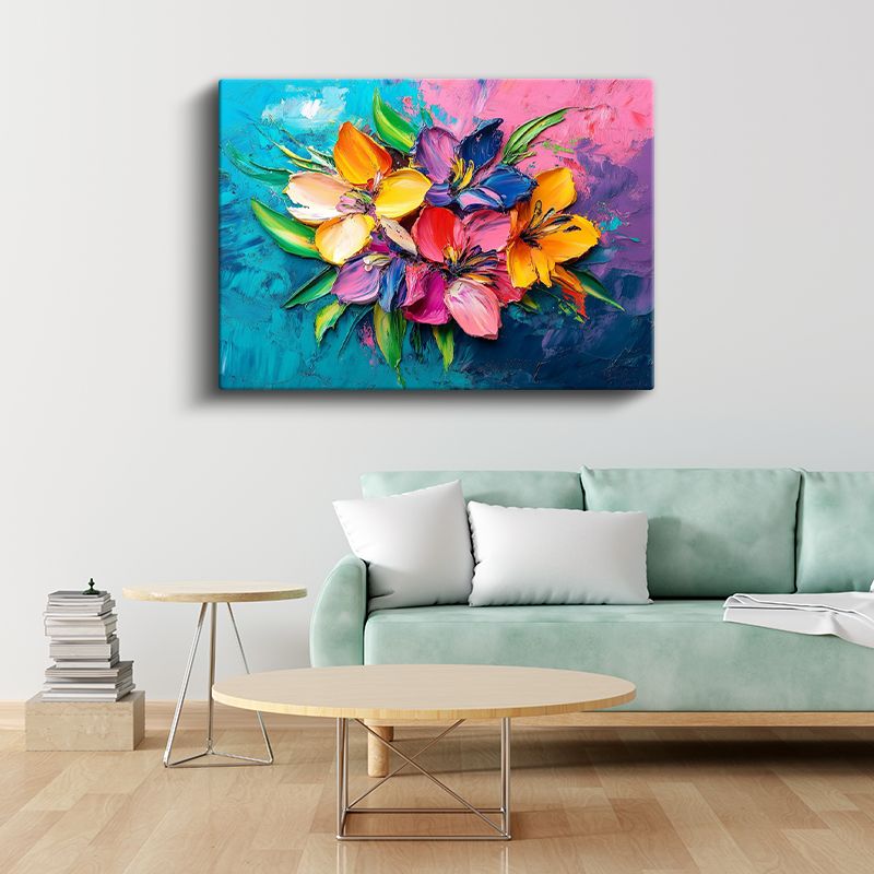 Renkli Zambaklar - Mavi Pembe Fonda Canlı Buket Kanvas Tablo