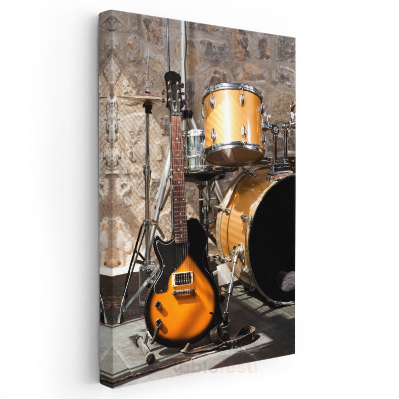 Rock Müzik Ekipmanları - Elektro Gitar ve Davul Seti Kanvas Tablo