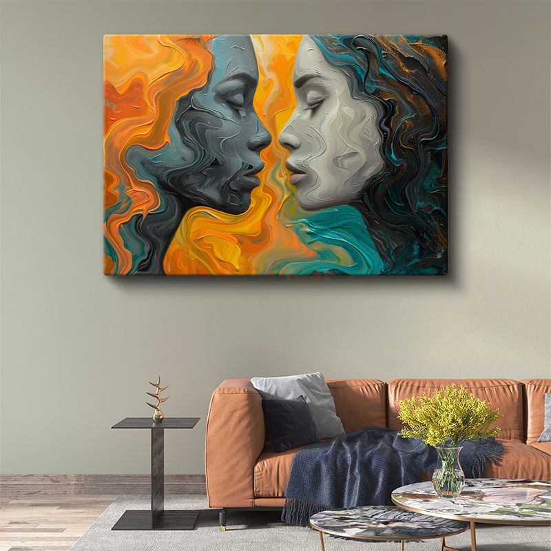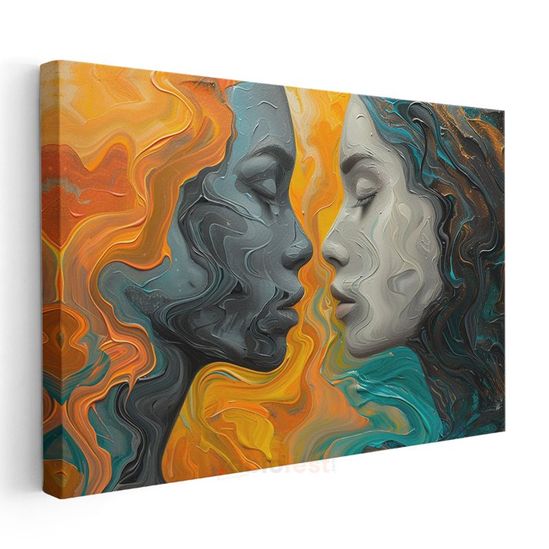 Ruhların Buluşması - Turuncu Turkuaz Soyut Portre Kanvas Tablo