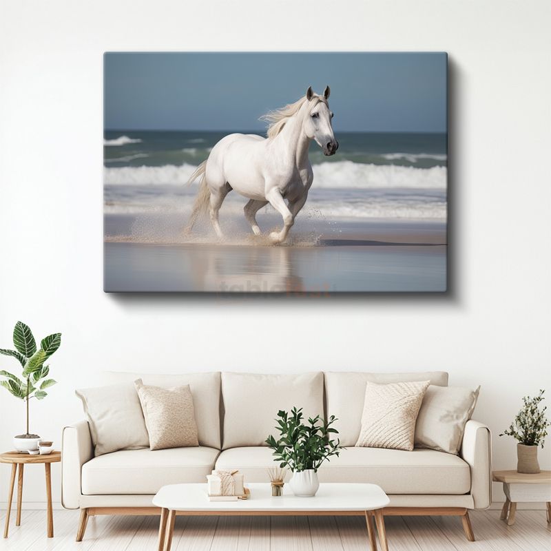 Sahilde Koşan Beyaz At - Özgürlüğün Zarif Dansı Kanvas Tablo