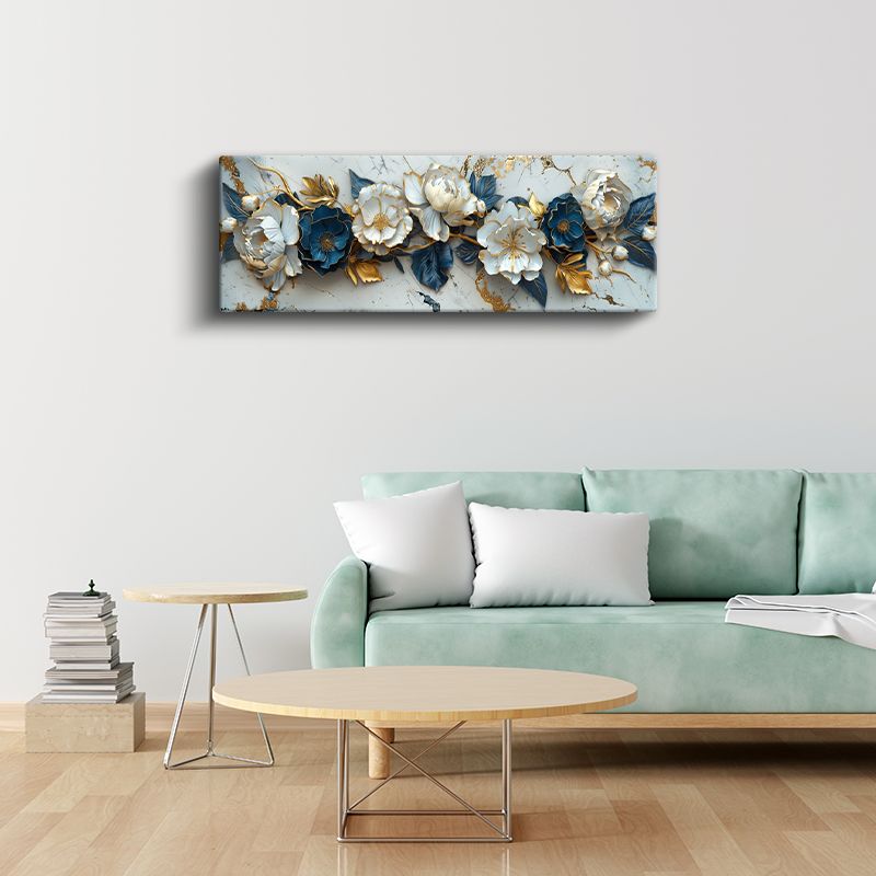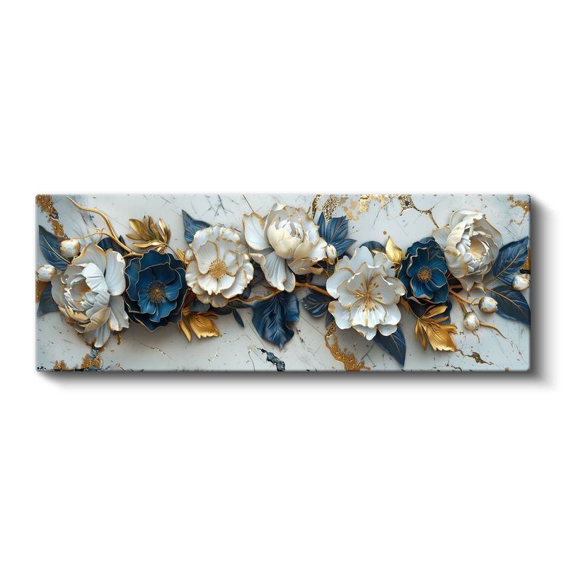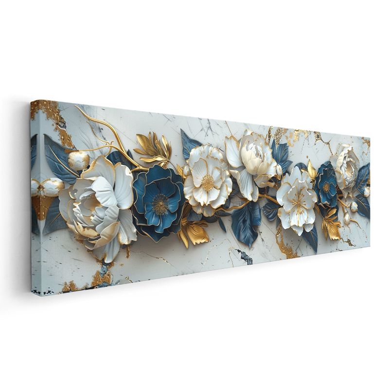 Şakayık Çiçekleri - Mavi Yapraklı Altın Detaylı Zarif Kompozisyon Kanvas Tablo