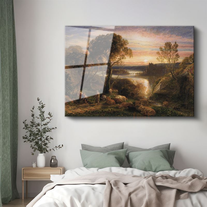 Samuel Palmer - Gün Batımında Pastoral Manzara Cam Tablo