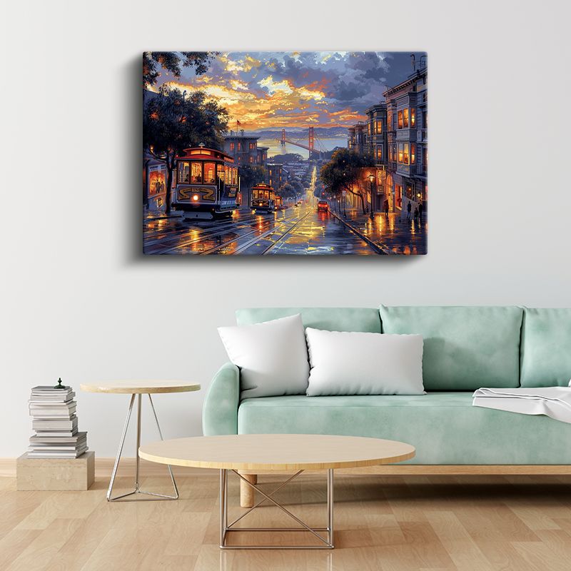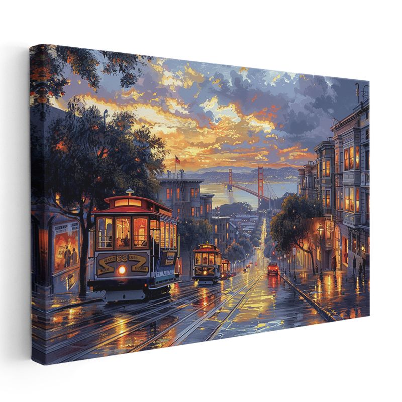 San Francisco Tramvayları - Golden Gate Manzaralı Cadde Kanvas Tablo