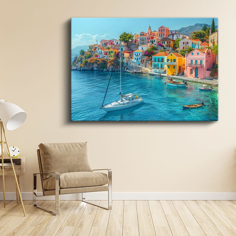Santorini Evleri - Turkuaz Deniz Manzarası Kanvas Tablo