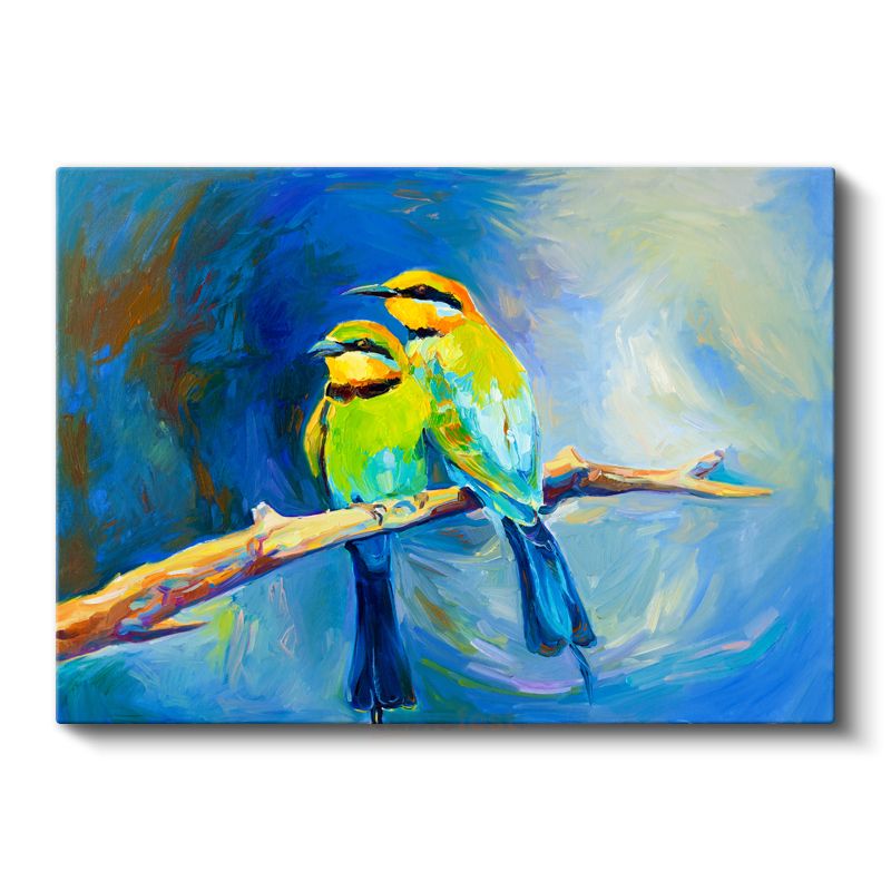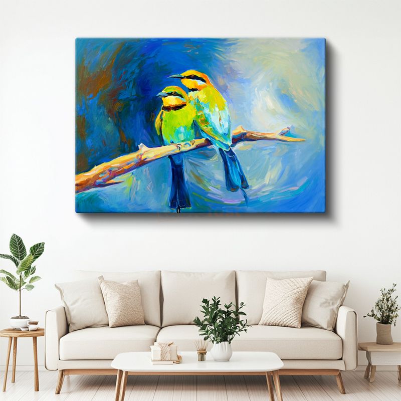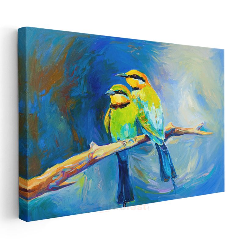 Sarı Arıkuşları - Dalda Duran Renkli Kuş Çifti Kanvas Tablo