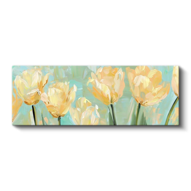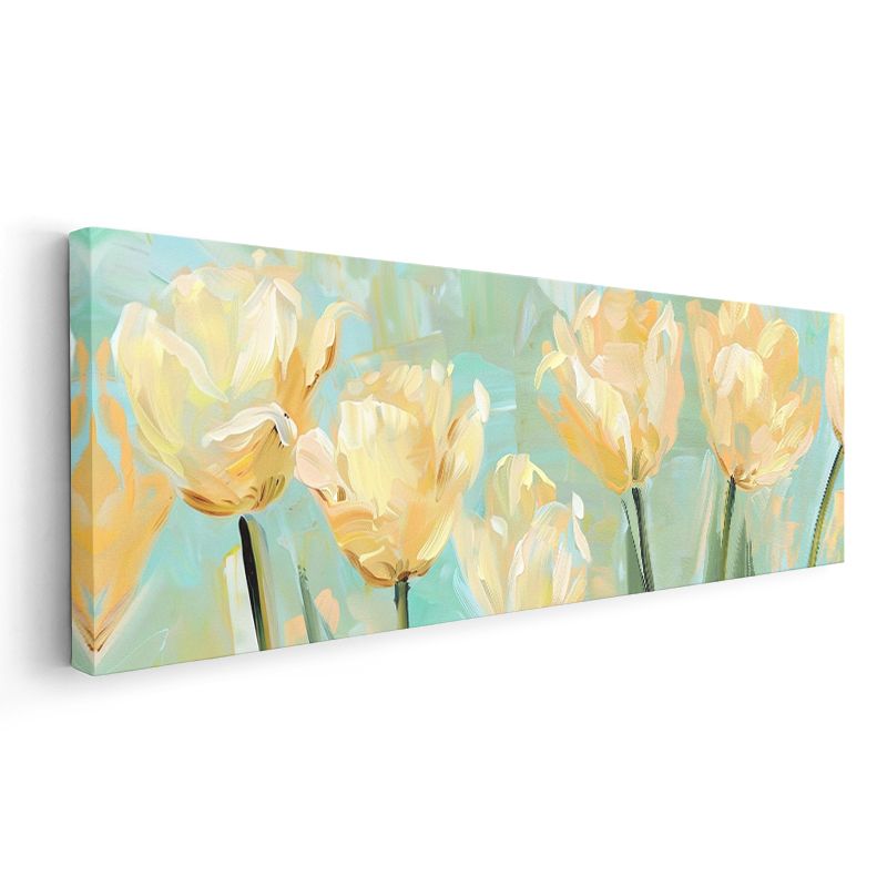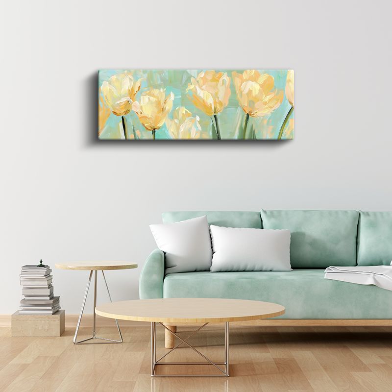 Sarı Laleler - Turkuaz Fonda Panoramik Çiçek Serisi Kanvas Tablo