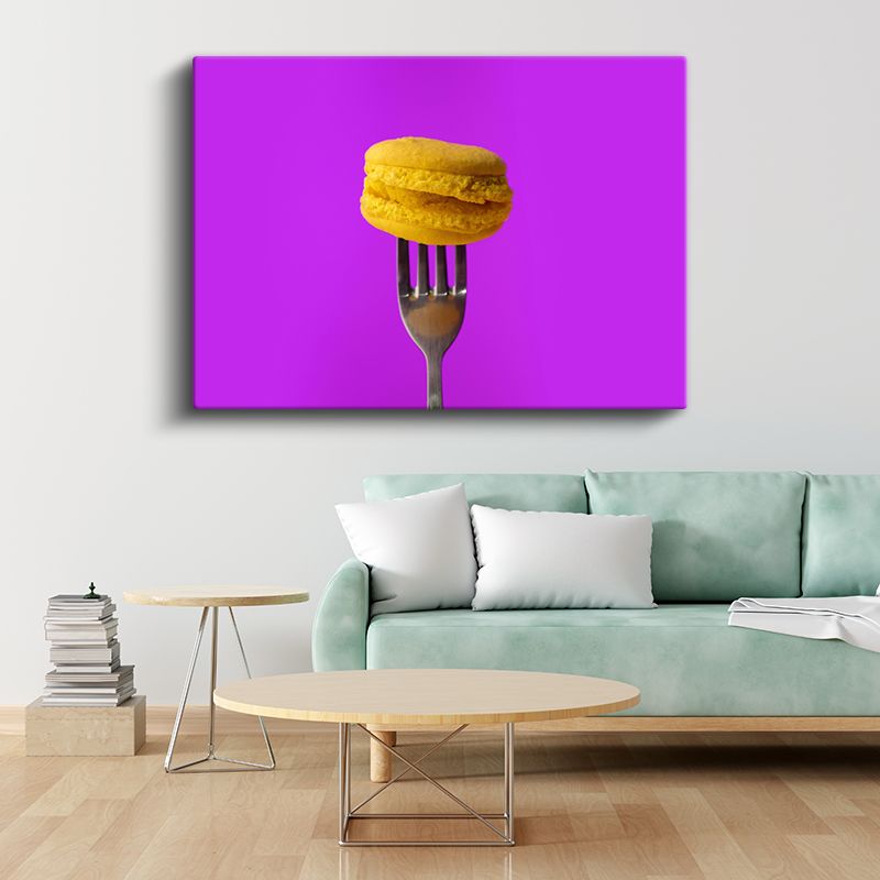 Sarı Macaron - Çatal Üzerinde Fransız Tatlısı Kanvas Tablo