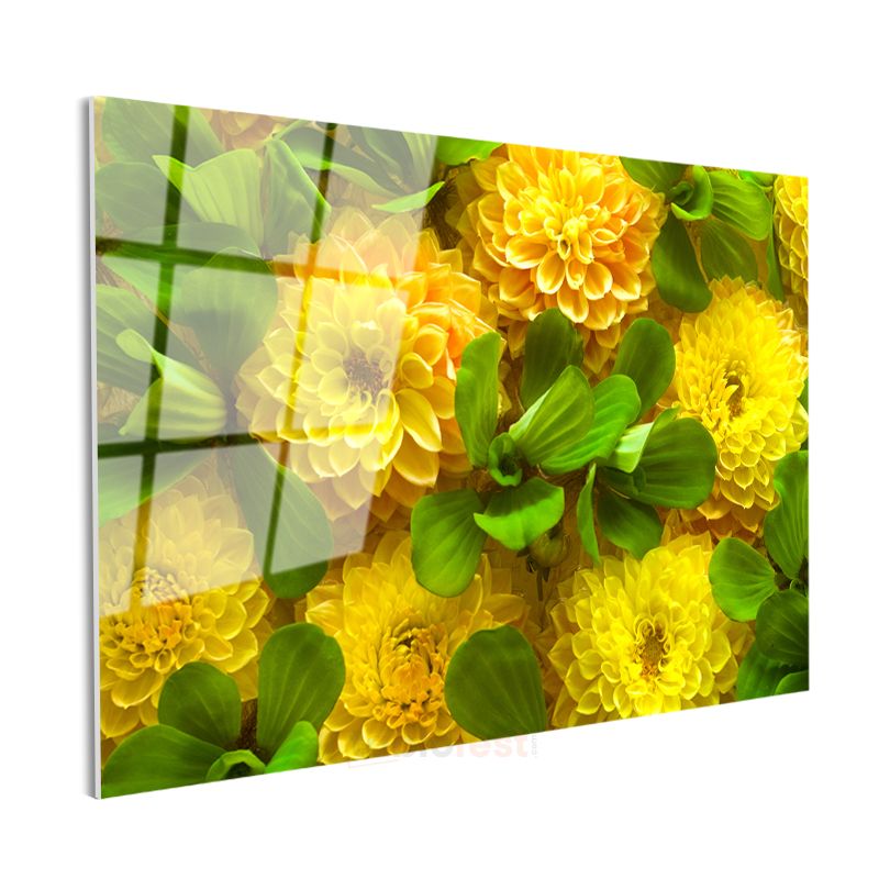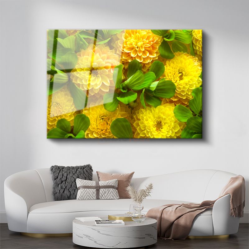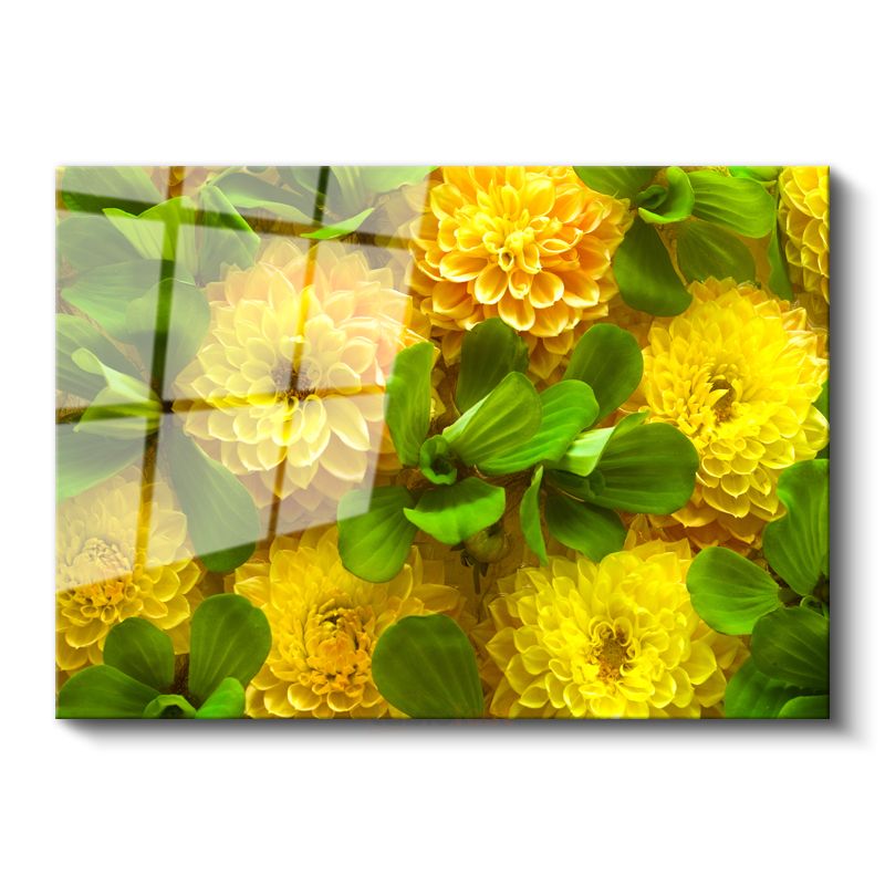 Sarı Yıldız Çiçekleri - Yeşil Yapraklarla Canlı Kompozisyon Cam Tablo
