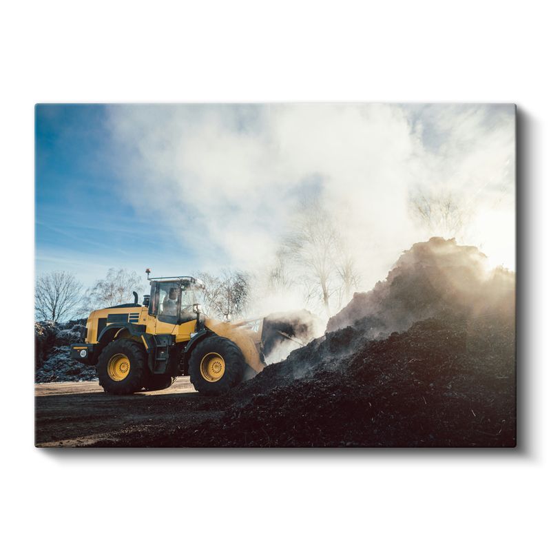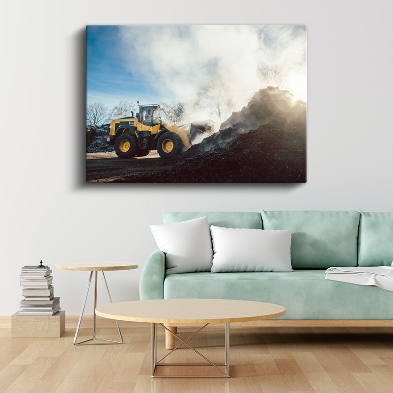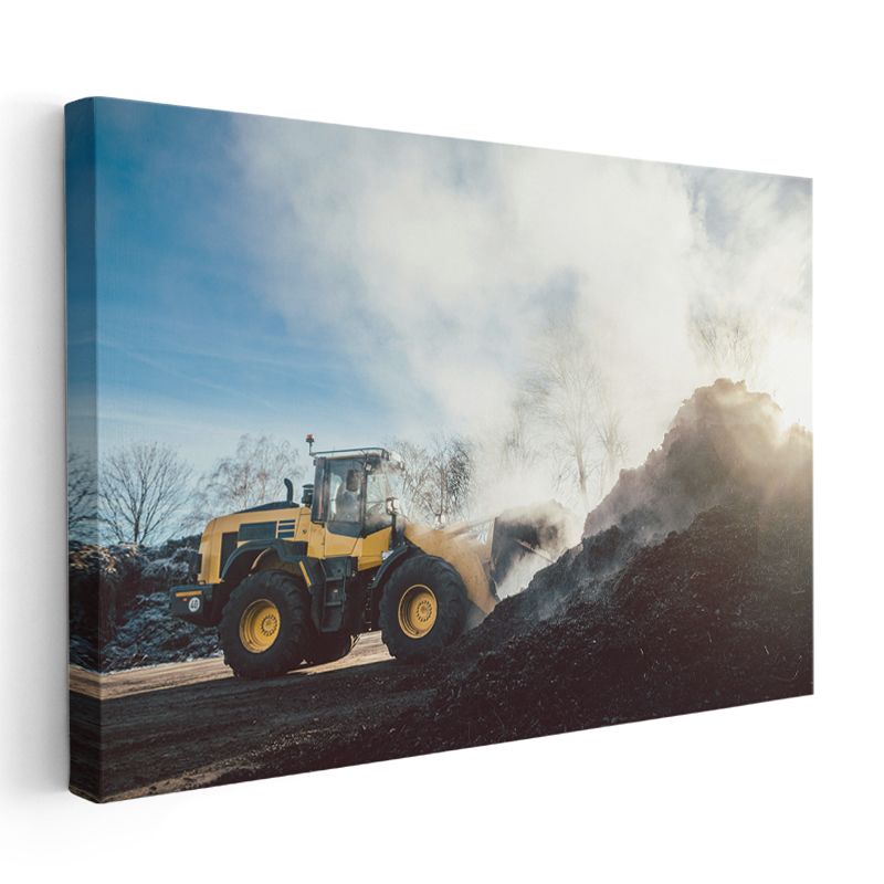 Sarı Yükleyici - Buhar Tüten Toprak Yığınında Çalışırken Kanvas Tablo