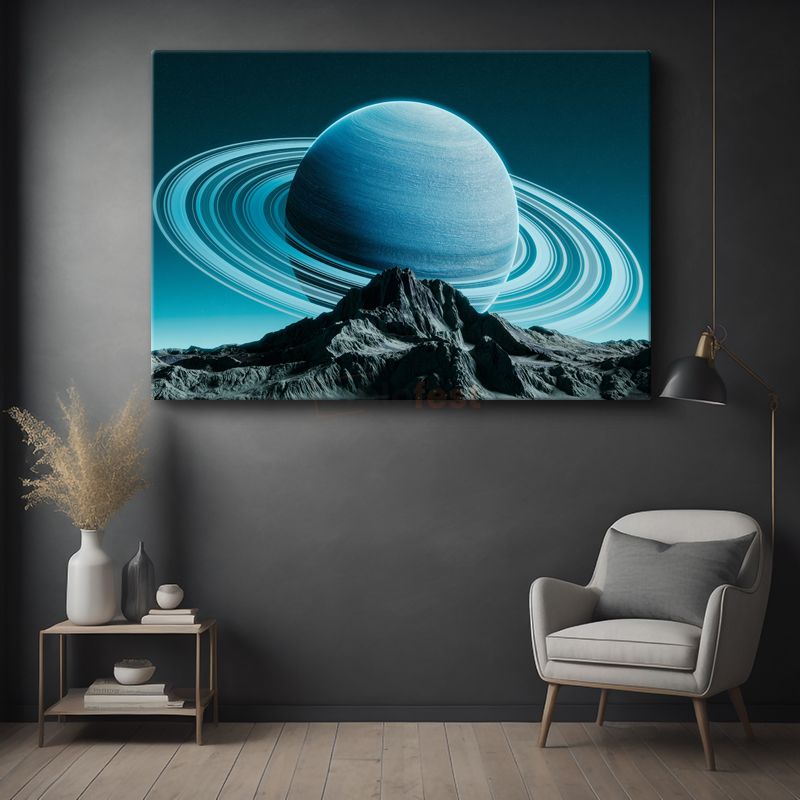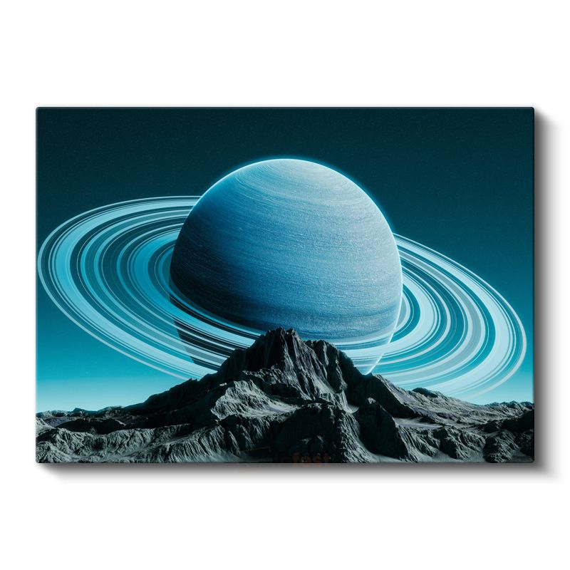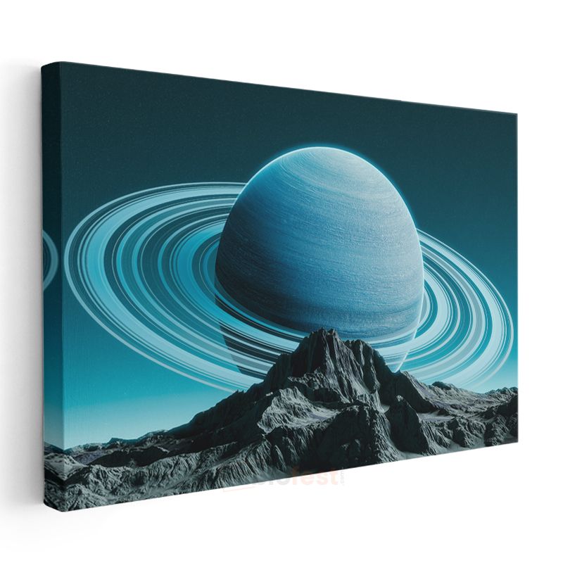 Satürn Gezegeni - Dağların Üzerinde Yükselen Kozmik Manzara Kanvas Tablo