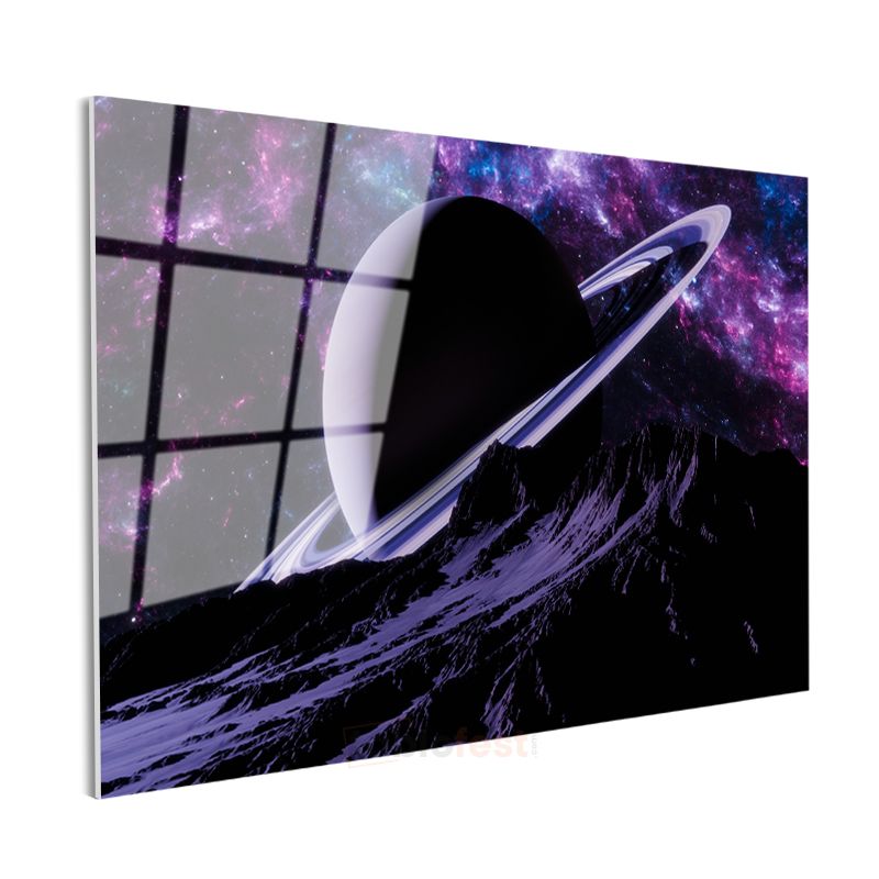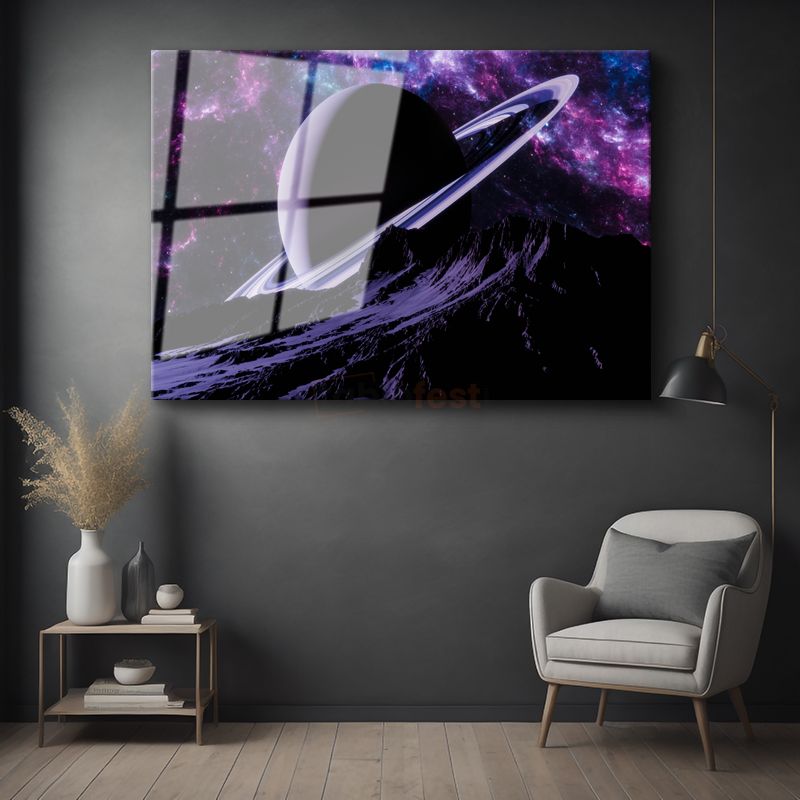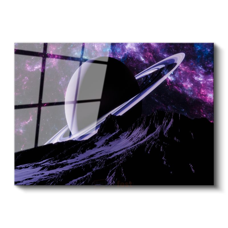 Satürn Manzarası - Mor Gökyüzünde Halkalı Gezegen Cam Tablo