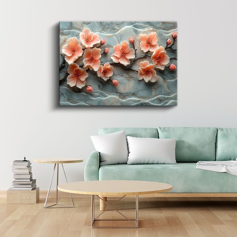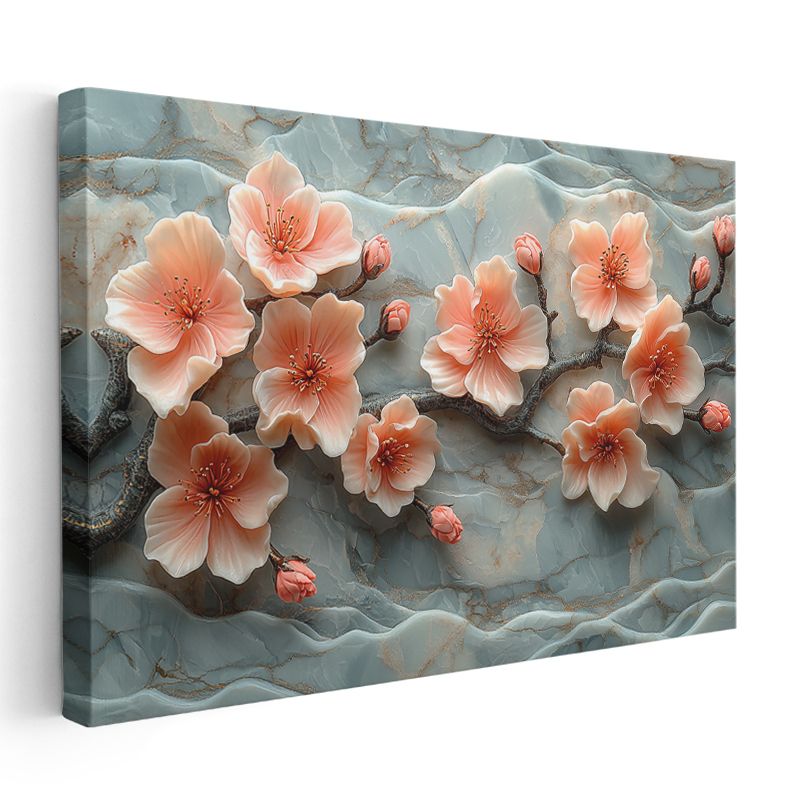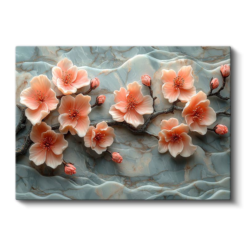 Şeftali Çiçekleri - Mermer Dokulu 3D Kanvas Tablo