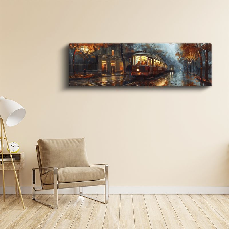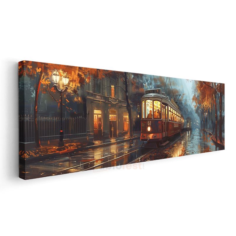Şehir Tramvayı - Yağmurlu Cadde Işıkları Kanvas Tablo