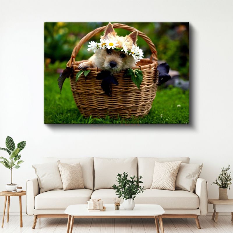 Sepetteki Yavru - Papatya Taçlı Sevimli Köpek Kanvas Tablo