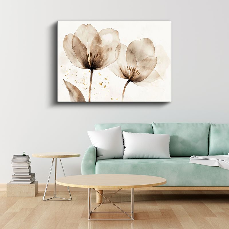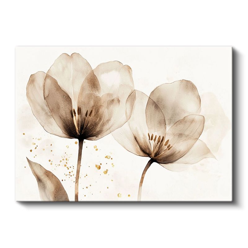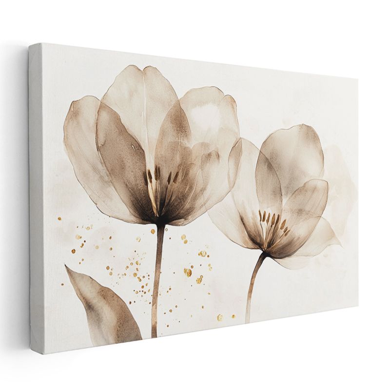 Sepya Laleler - Altın Detaylı Sulu Boya Tarzı Kanvas Tablo