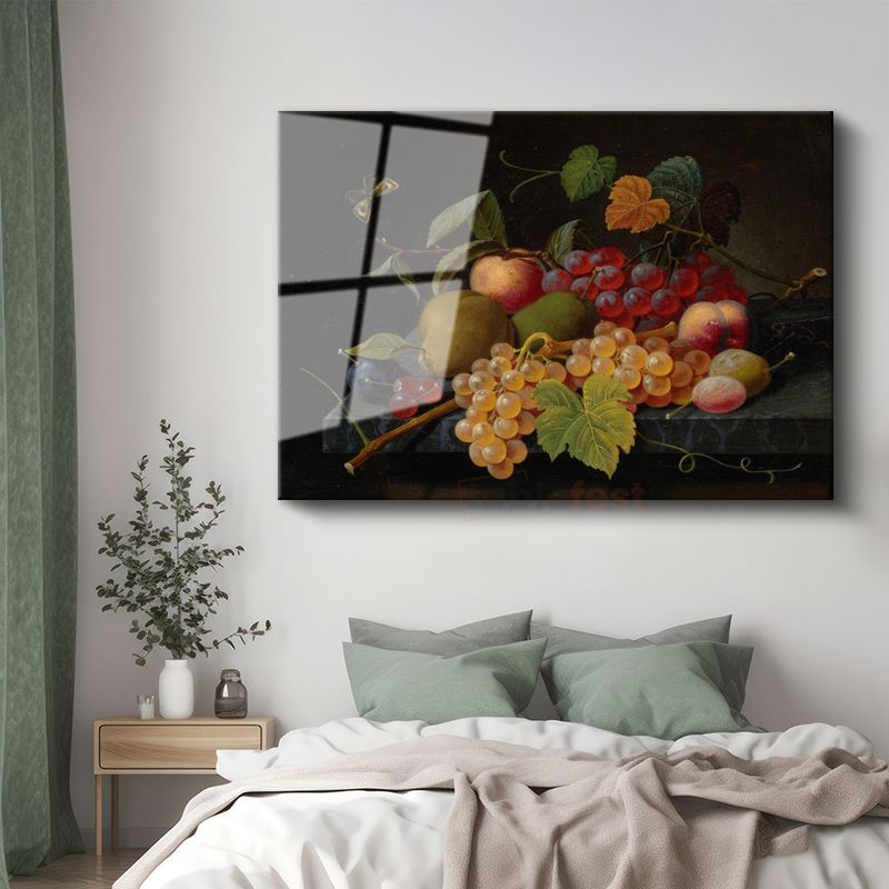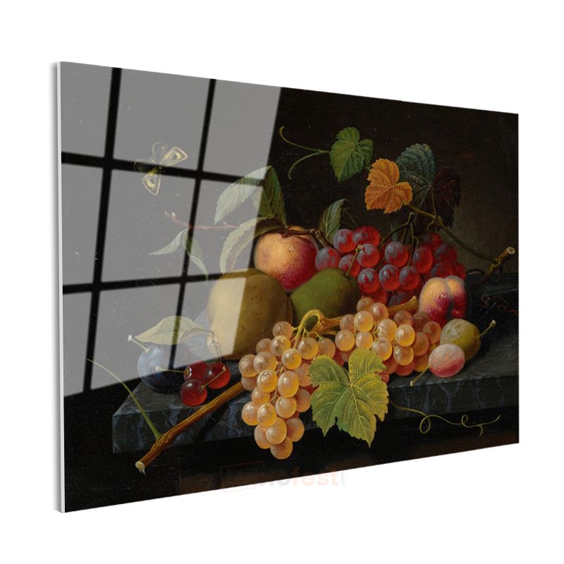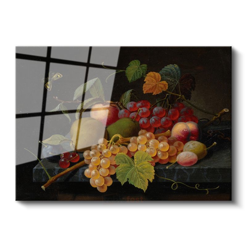 Severin Roesen - Meyveler ve Kelebek Natürmortu Cam Tablo