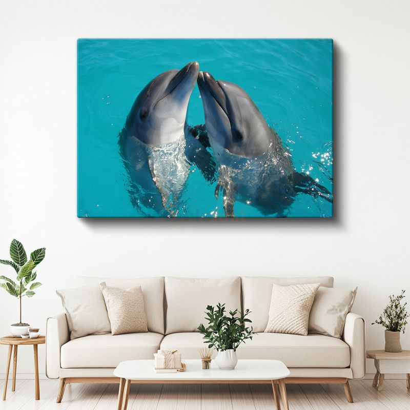 Sevgi Dolu Yunuslar - Turkuaz Suda Buluşma Anı Kanvas Tablo