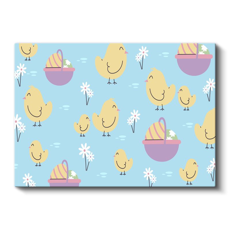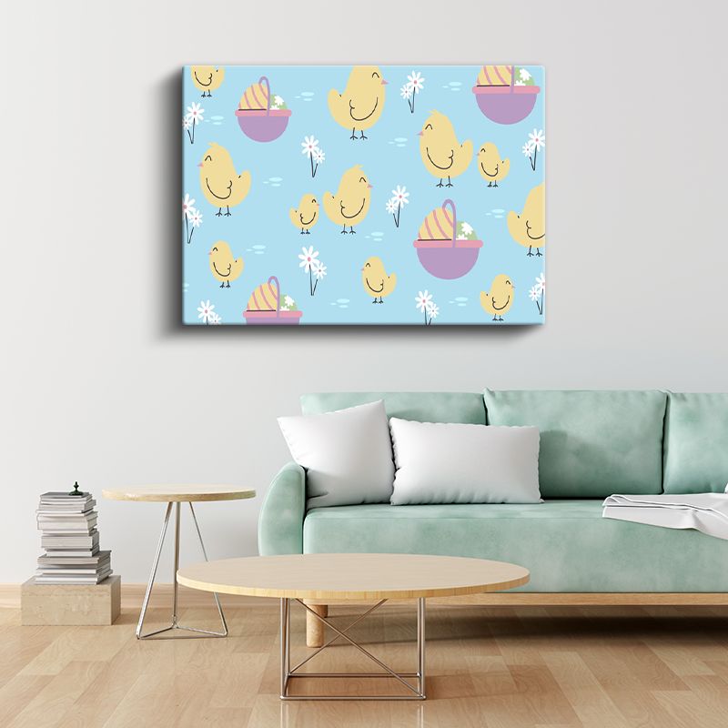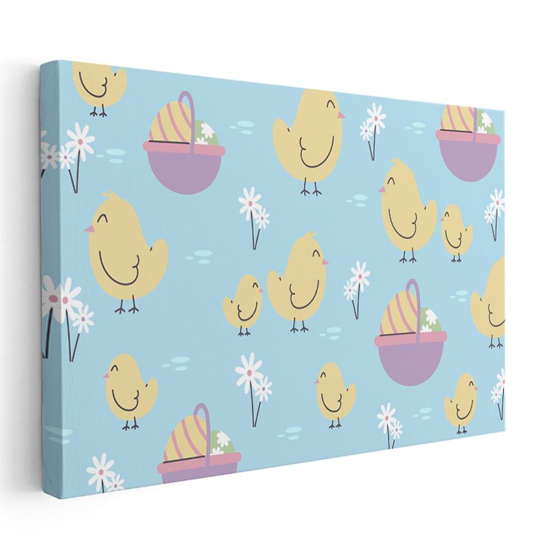 Sevimli Civcivler - Mavi Zeminde Çiçekli Desen Kanvas Tablo