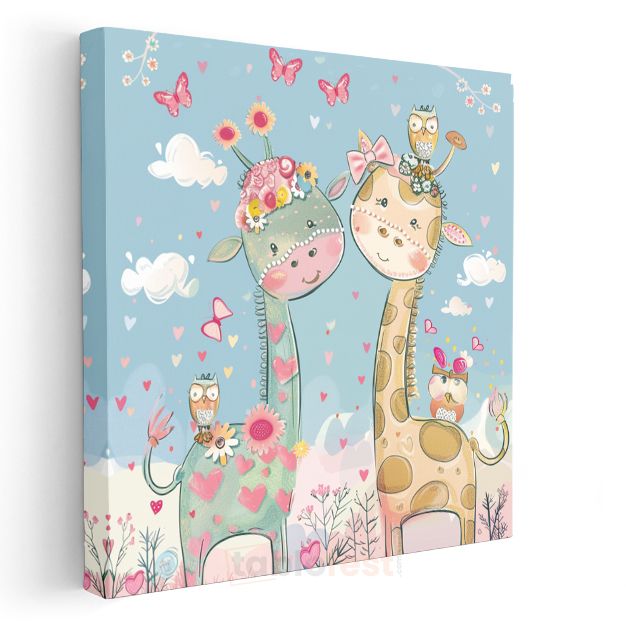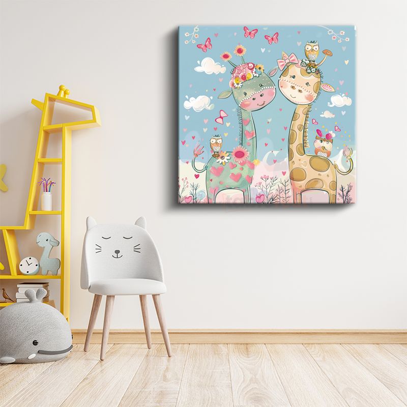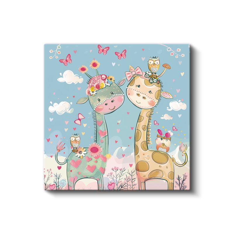Sevimli Zürafalar - Çiçekli Dostluk Kanvas Tablo