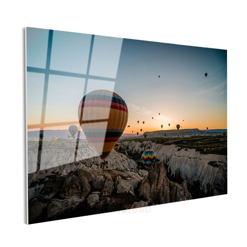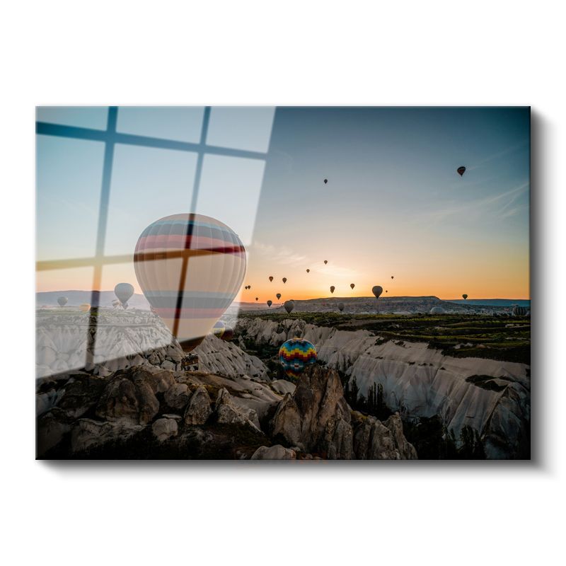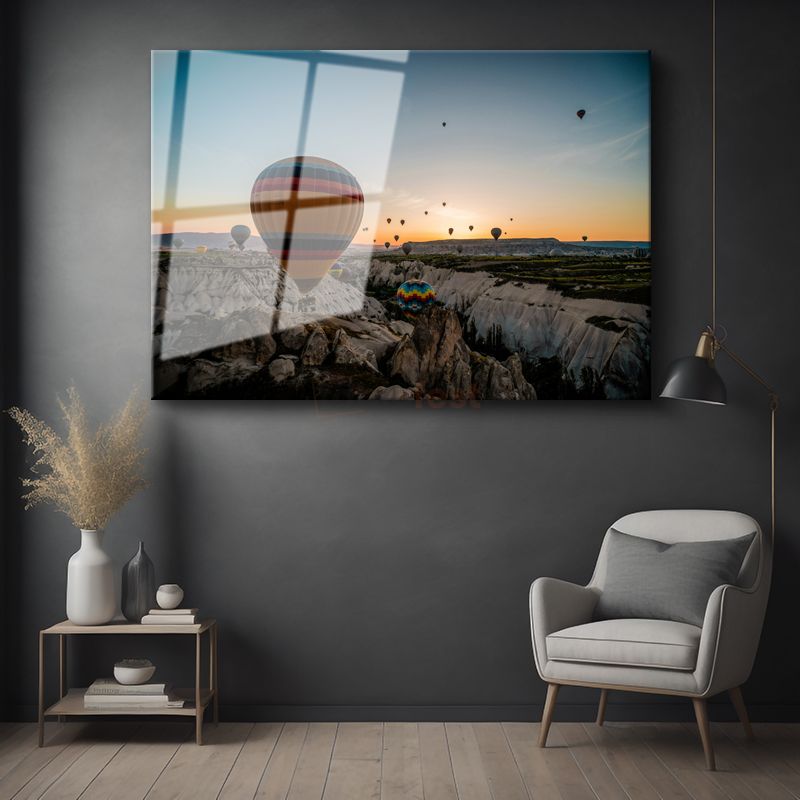 Sıcak Hava Balonları - Kayalık Vadide Gün Doğumu Cam Tablo