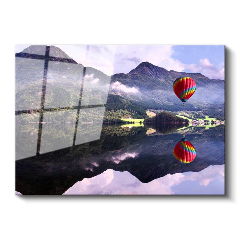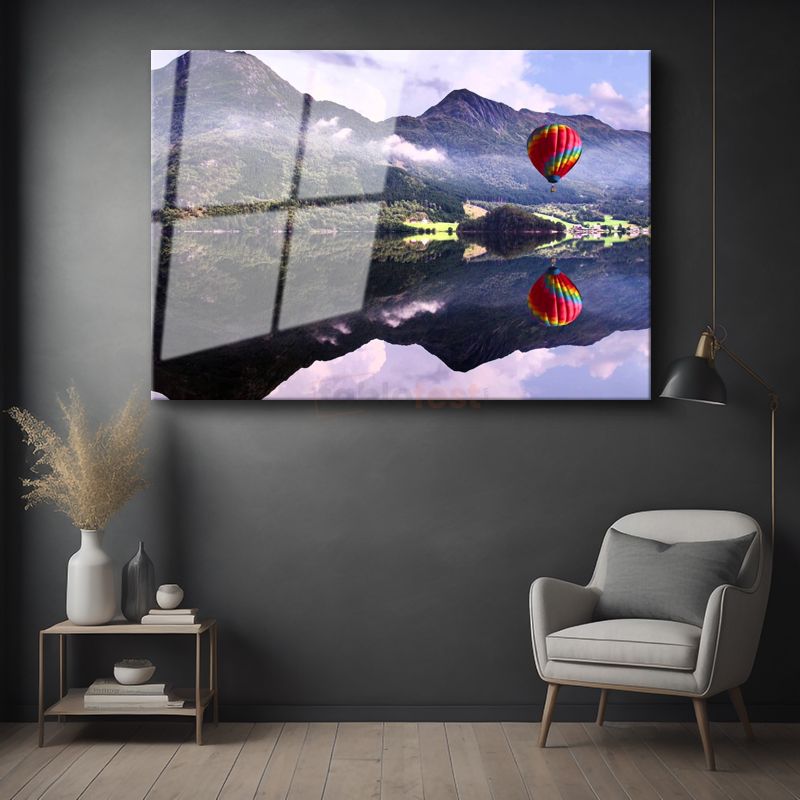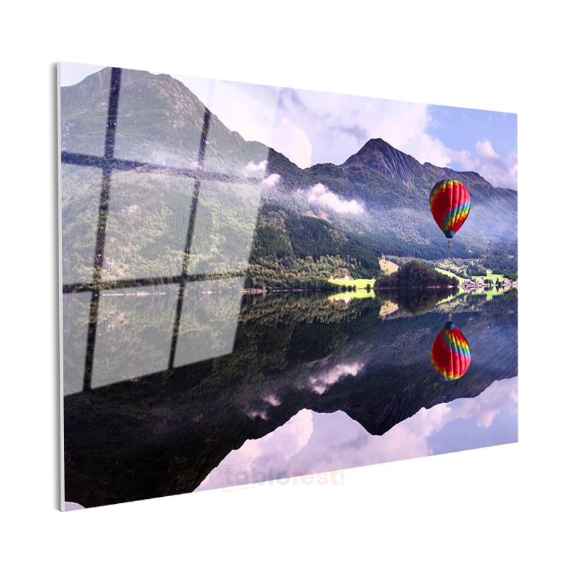 Sıcak Hava Balonu - Dağlar Arasında Renkli Yolculuk Cam Tablo