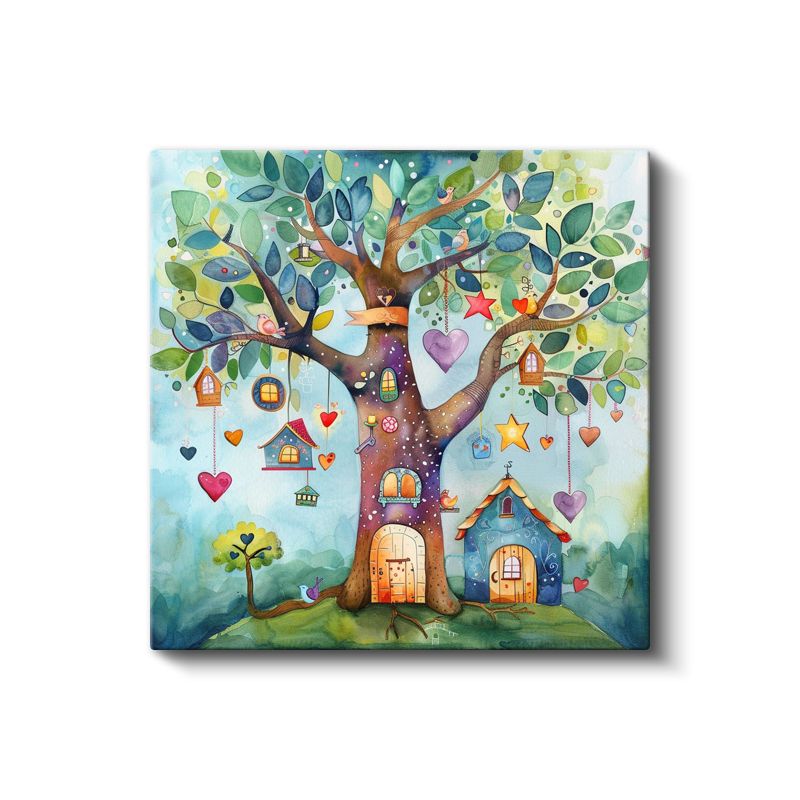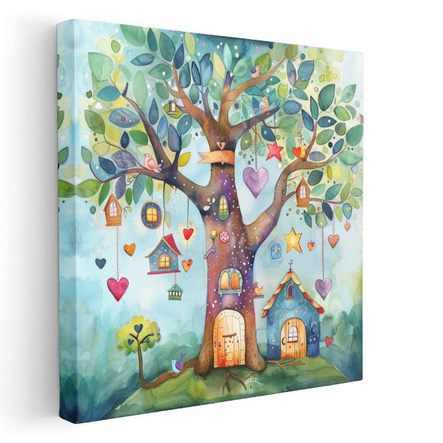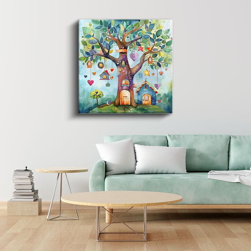 Sihirli Ağaç - Renkli Yapraklar ve Küçük Evler Kanvas Tablo