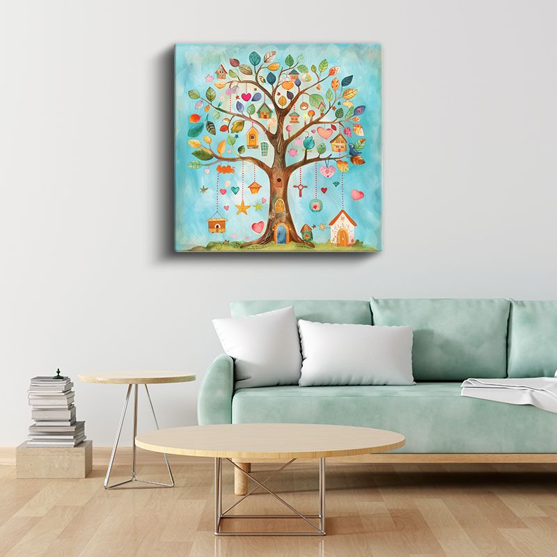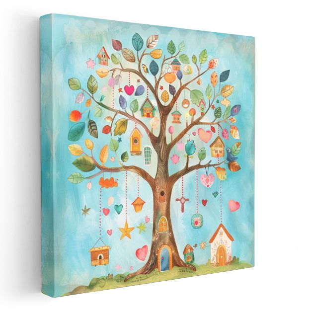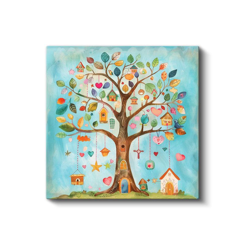 Sihirli Ağaç - Renkli Yapraklar ve Küçük Evler Kanvas Tablo