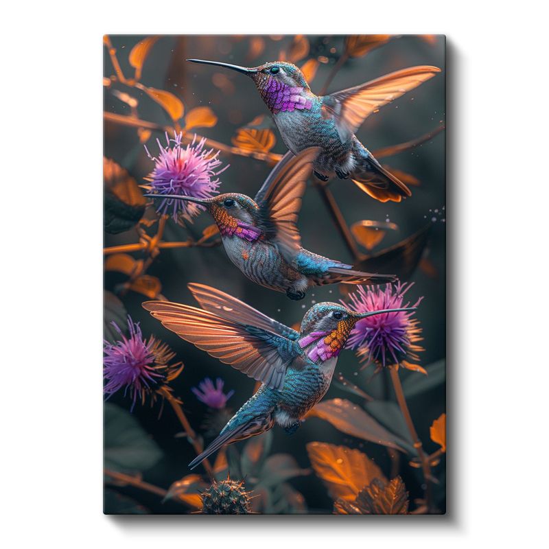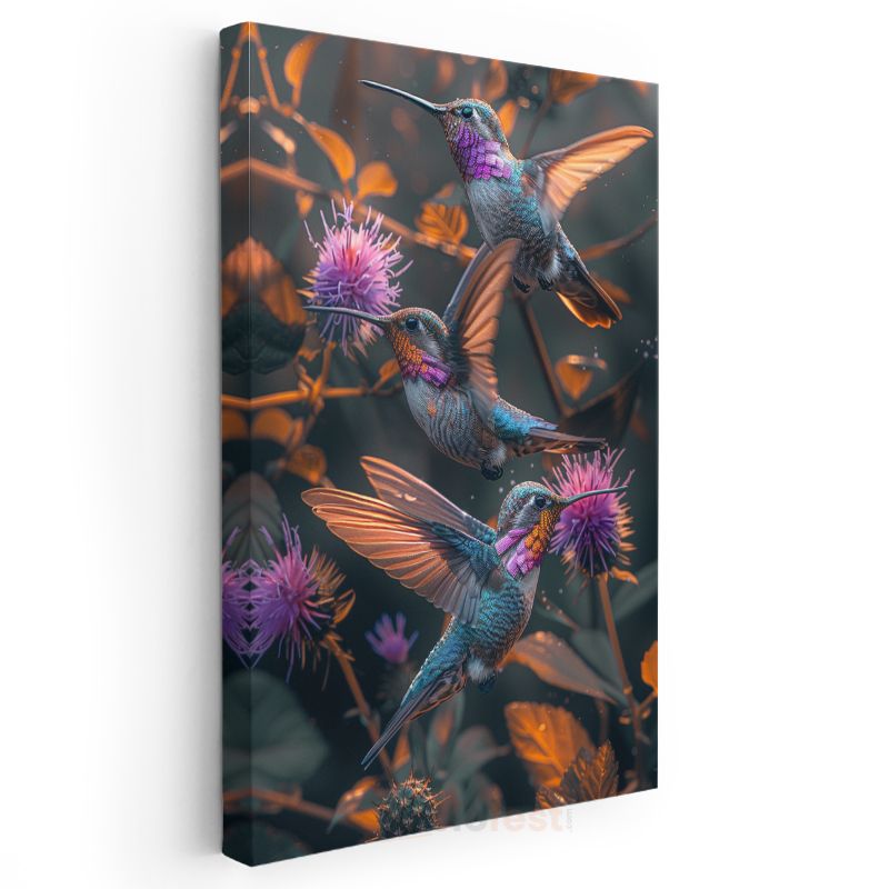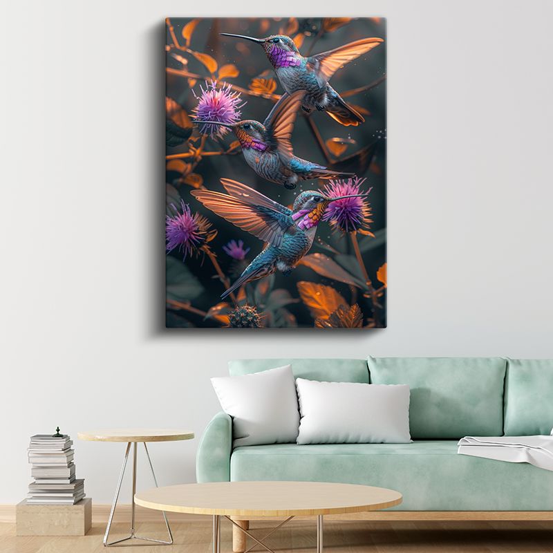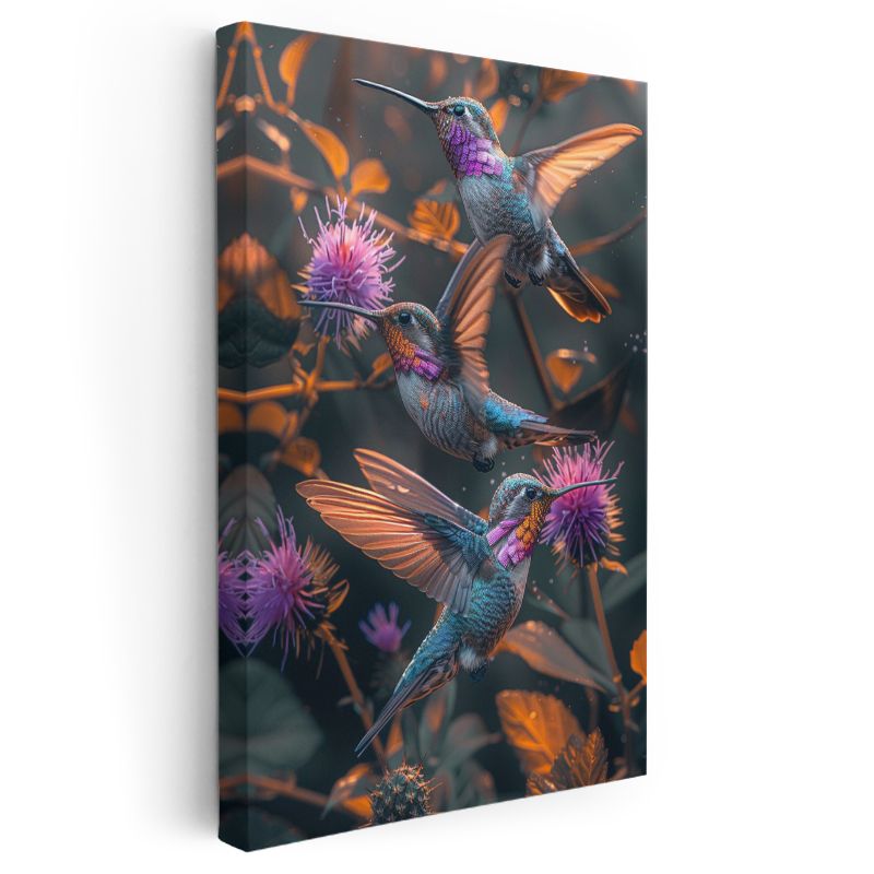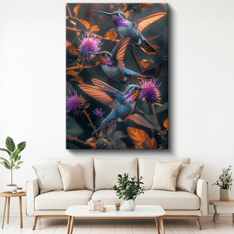 Sinek Kuşları - Mor Çiçekler Arasında Renkli Kanatlar Kanvas Tablo