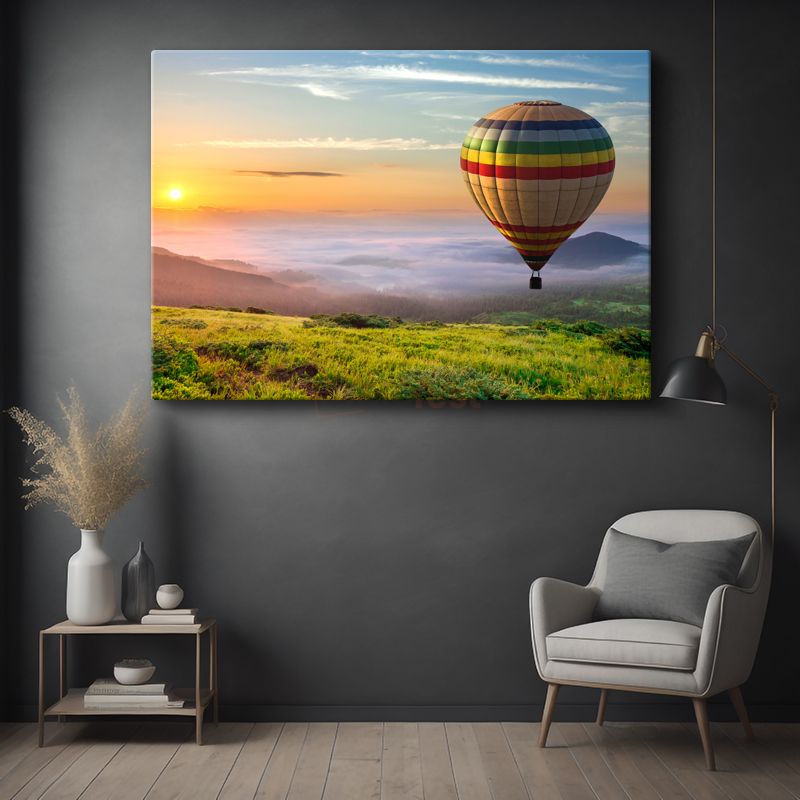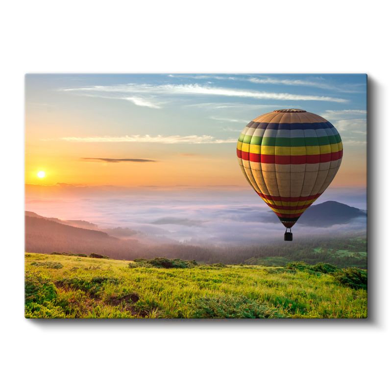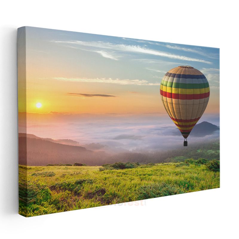 Sis Üstünde Yolculuk - Gün Doğumunda Renkli Sıcak Hava Balonu Kanvas Tablo