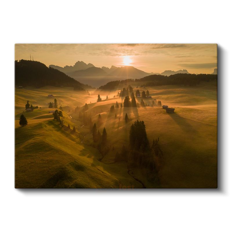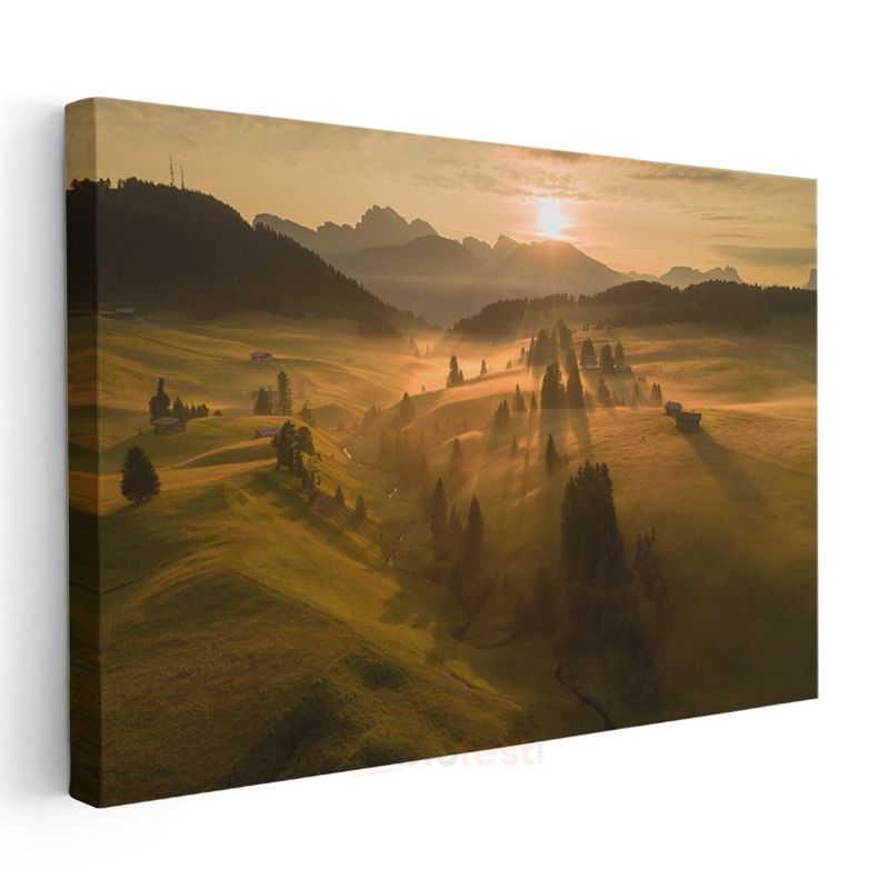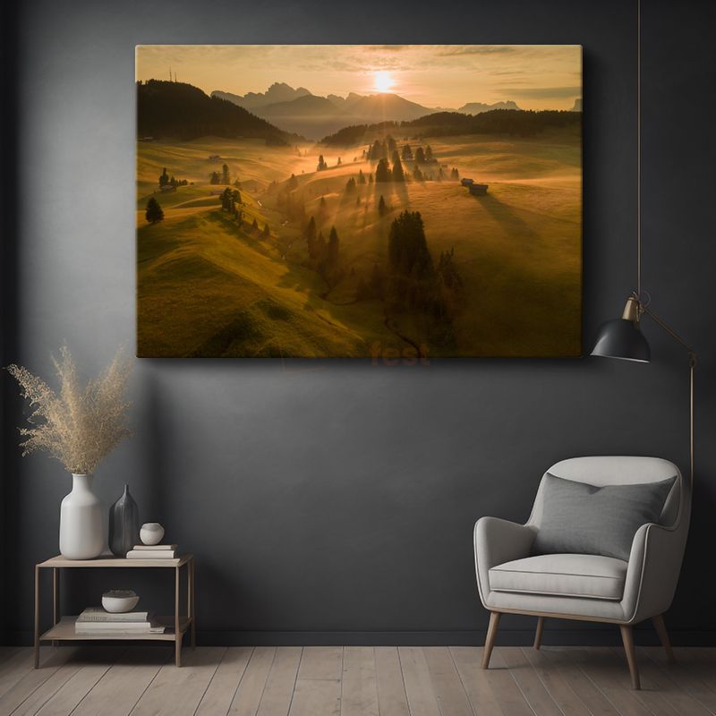 Sisli Tepeler - Gün Doğumunda Altın Işıklarla Aydınlanan Vadi Kanvas Tablo