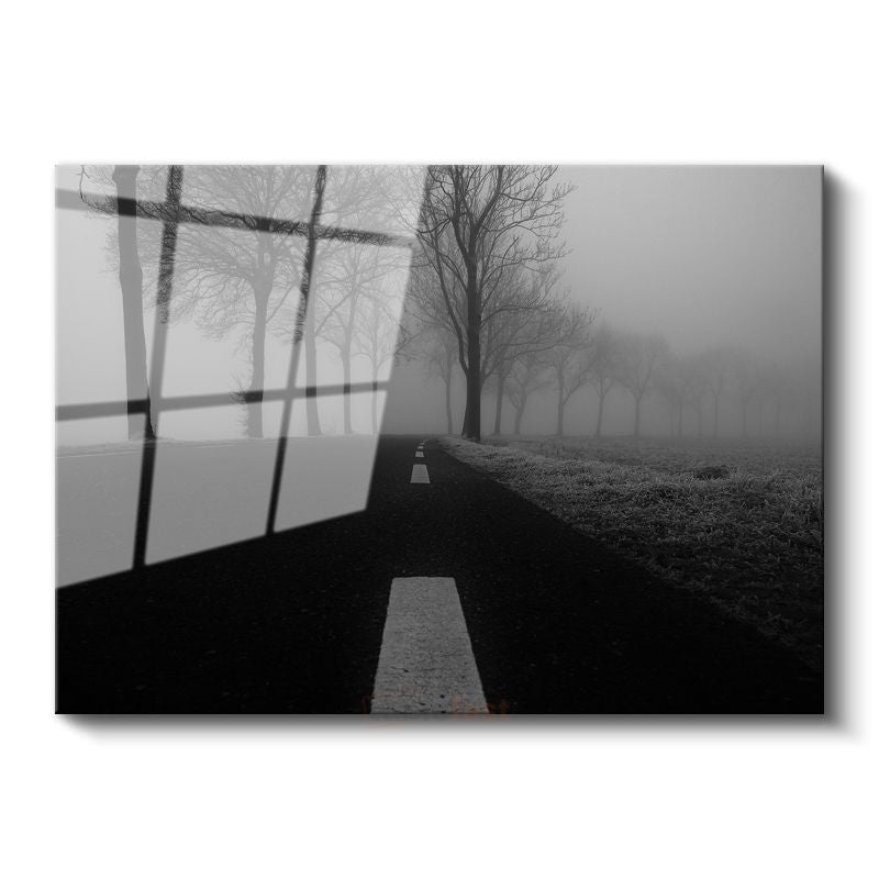 Sisli Yol - Siyah Beyaz Minimalist Doğa Perspektifi Cam Tablo