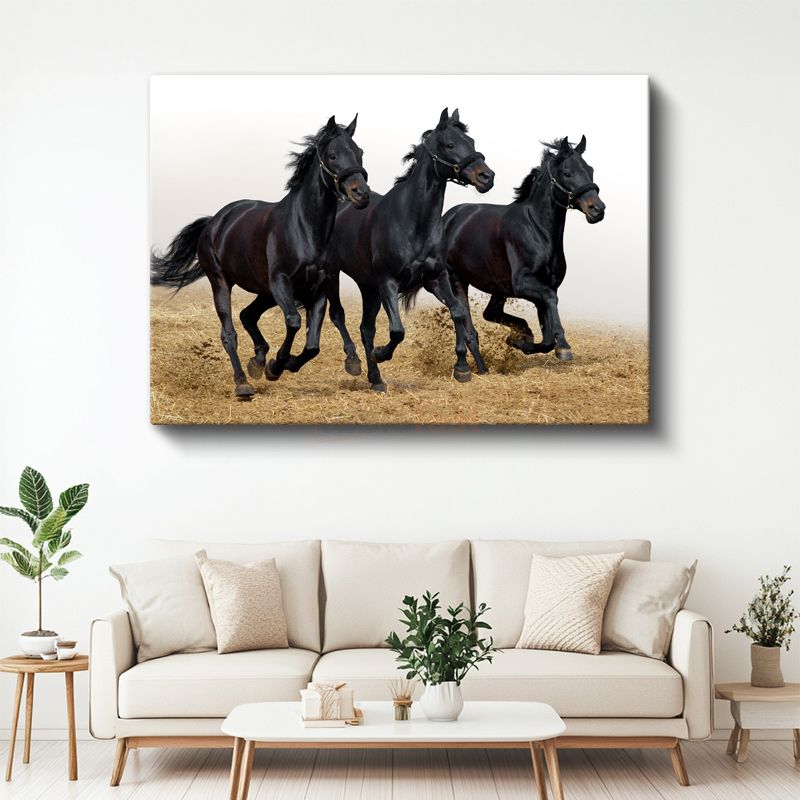 Siyah Atlar - Özgürce Koşan Üçlü Kanvas Tablo