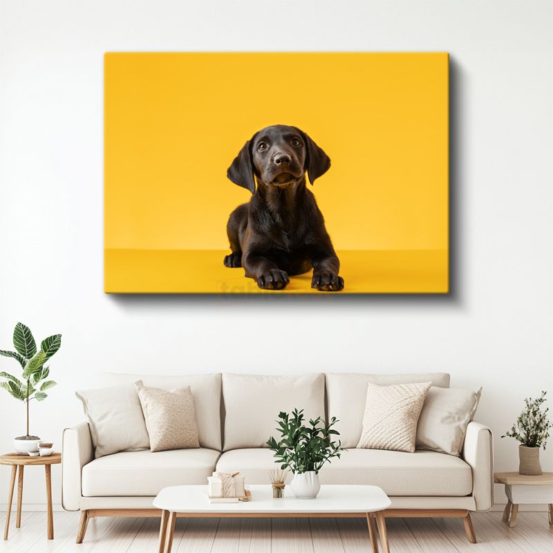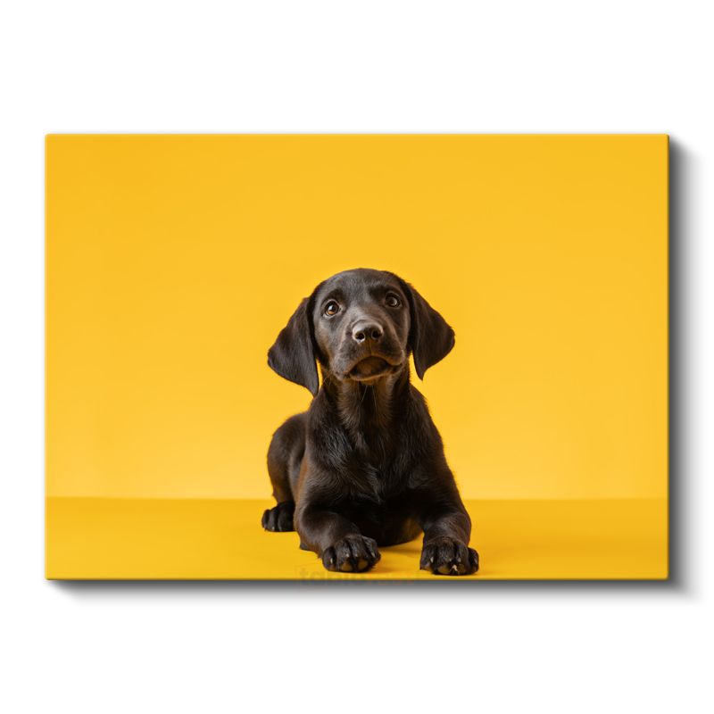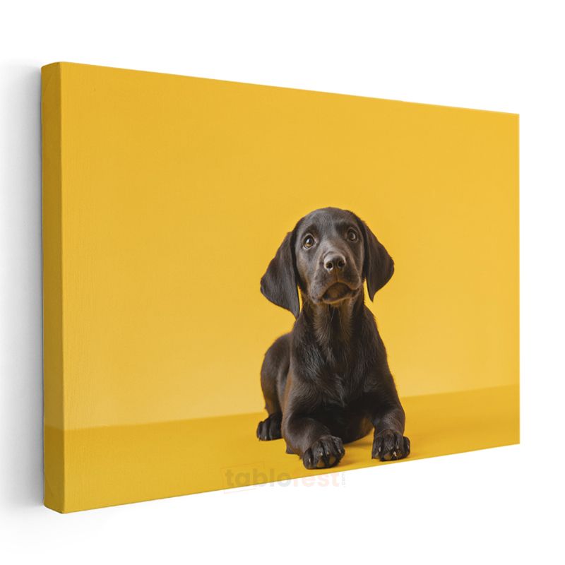 Siyah Labrador Yavrusu - Sarı Zeminde Sevimli Bakışlar Kanvas Tablo