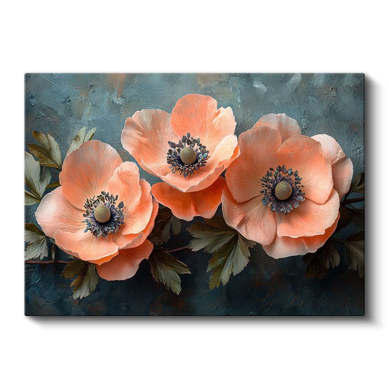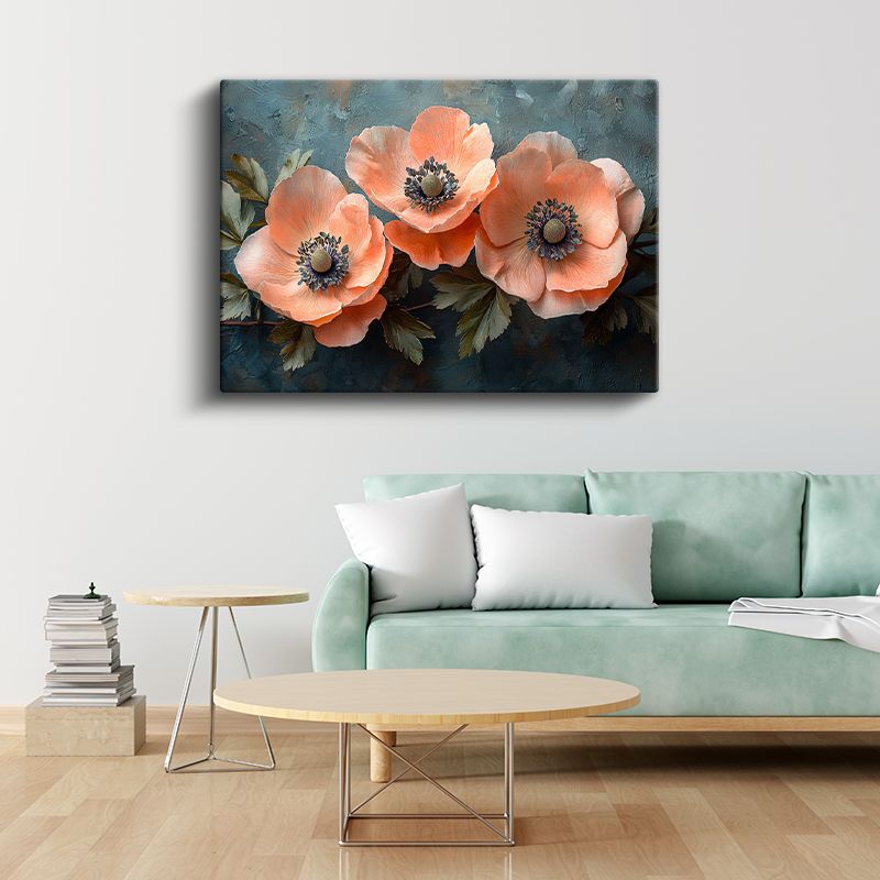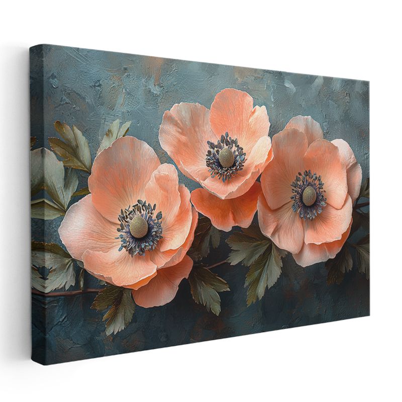 Somon Anemonlar - Mavi Fonda Zarif Çiçek Üçlemesi Kanvas Tablo