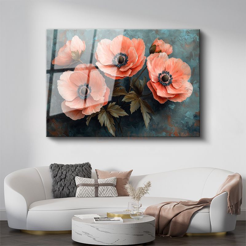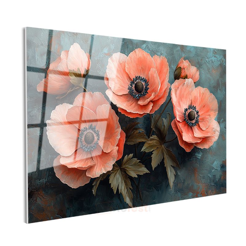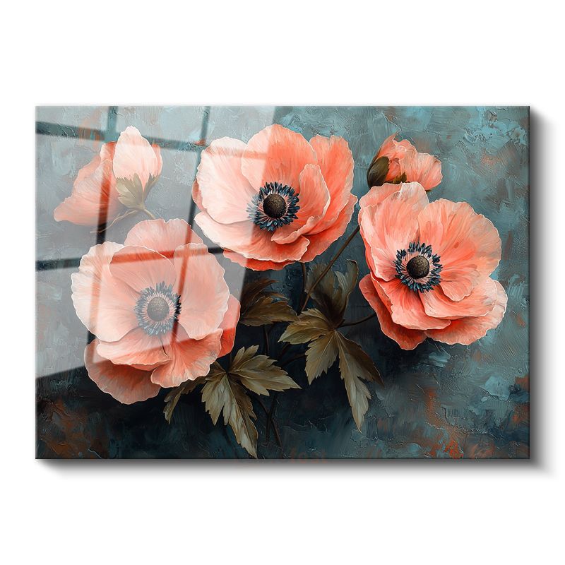 Somon Gelincikler - Turkuaz Fonda Yağlı Boya Tekniği Cam Tablo