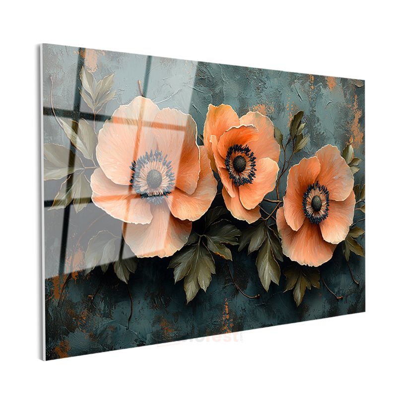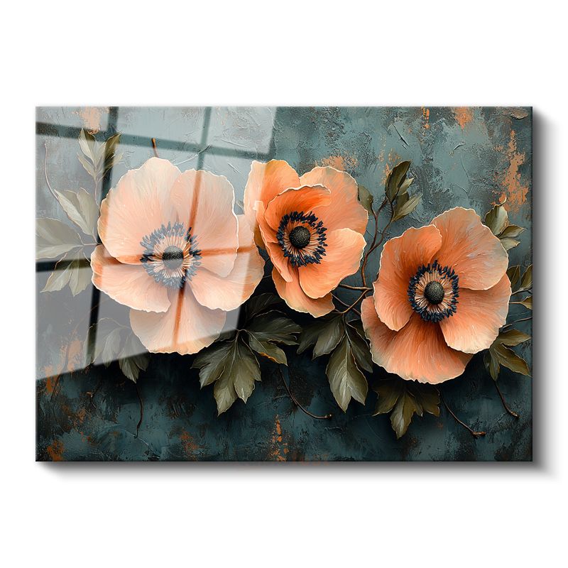 Somon Gelincikler - Turkuaz Fonda Yağlı Boya Tekniği Cam Tablo