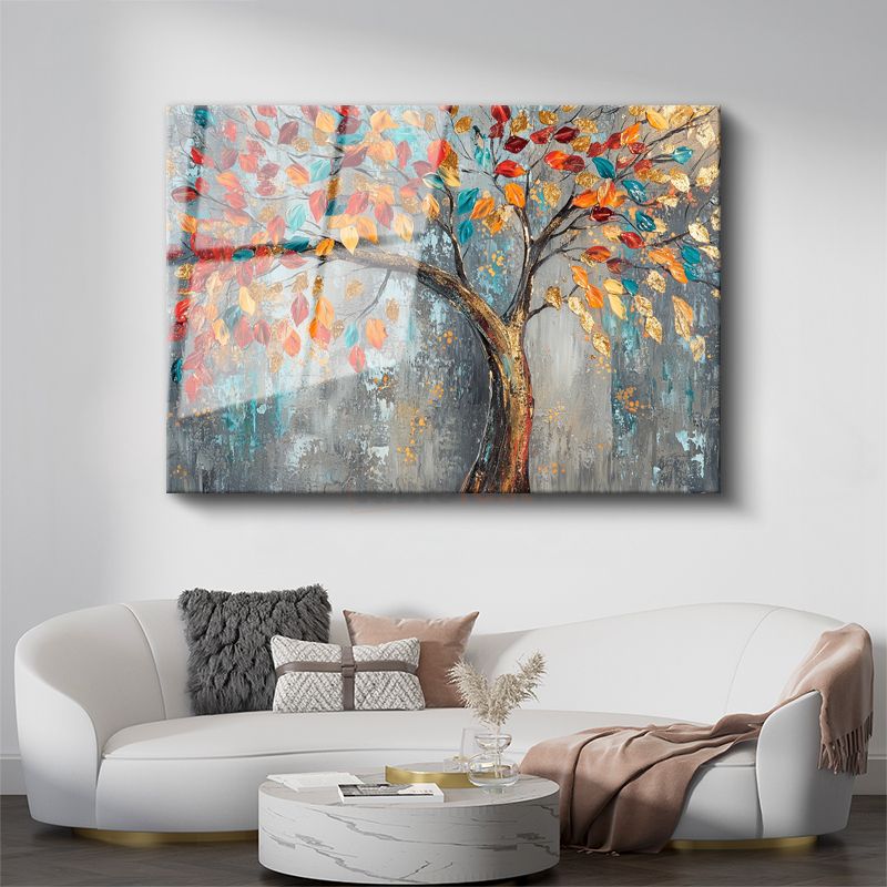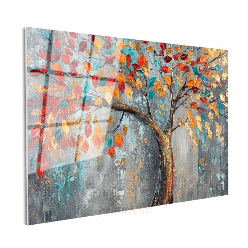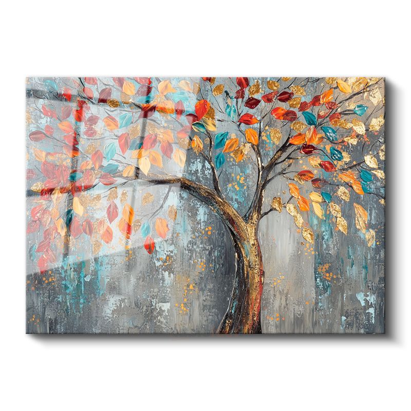 Sonbahar Ağacı - Renkli Yapraklı Altın Gövdeli Sanat Cam Tablo
