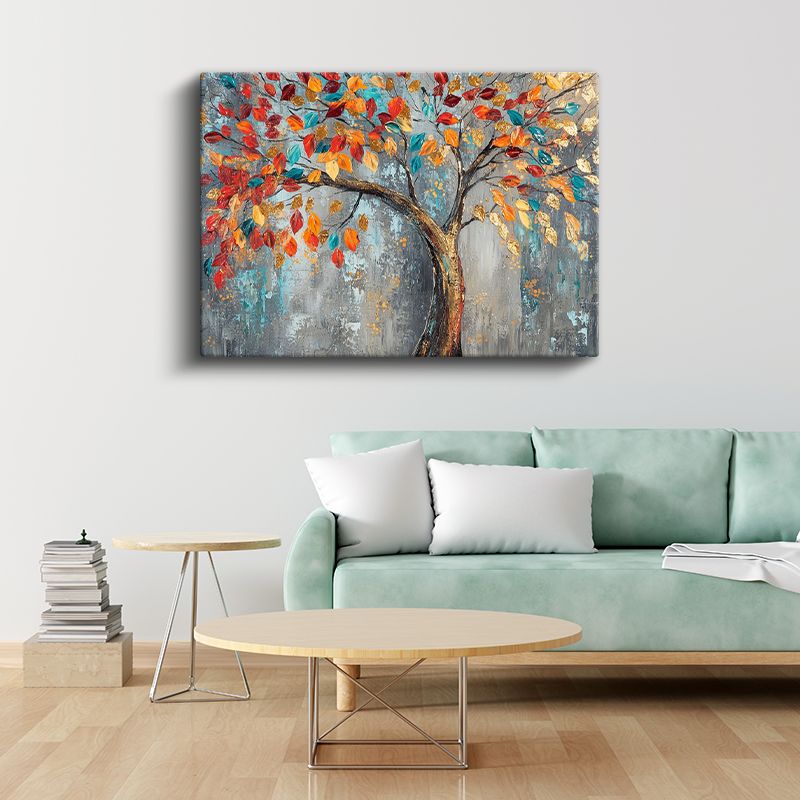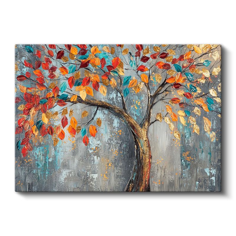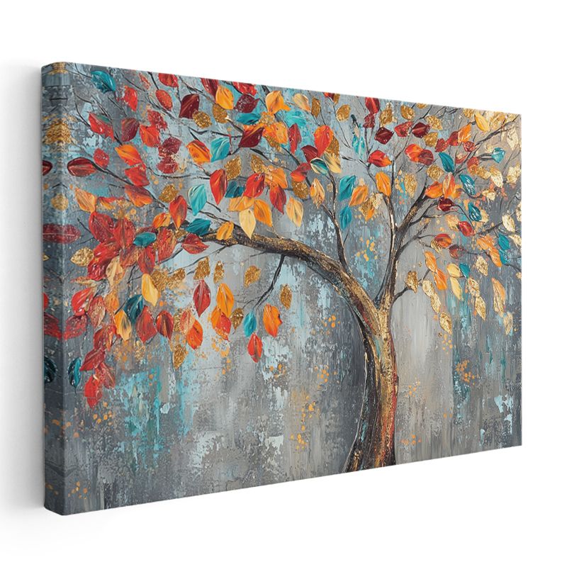 Sonbahar Ağacı - Renkli Yapraklı Altın Gövdeli Sanat Kanvas Tablo