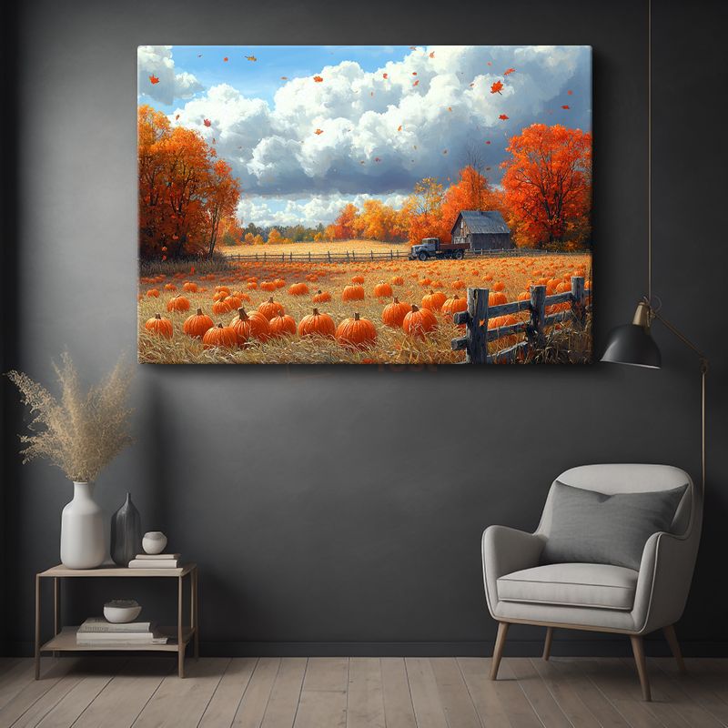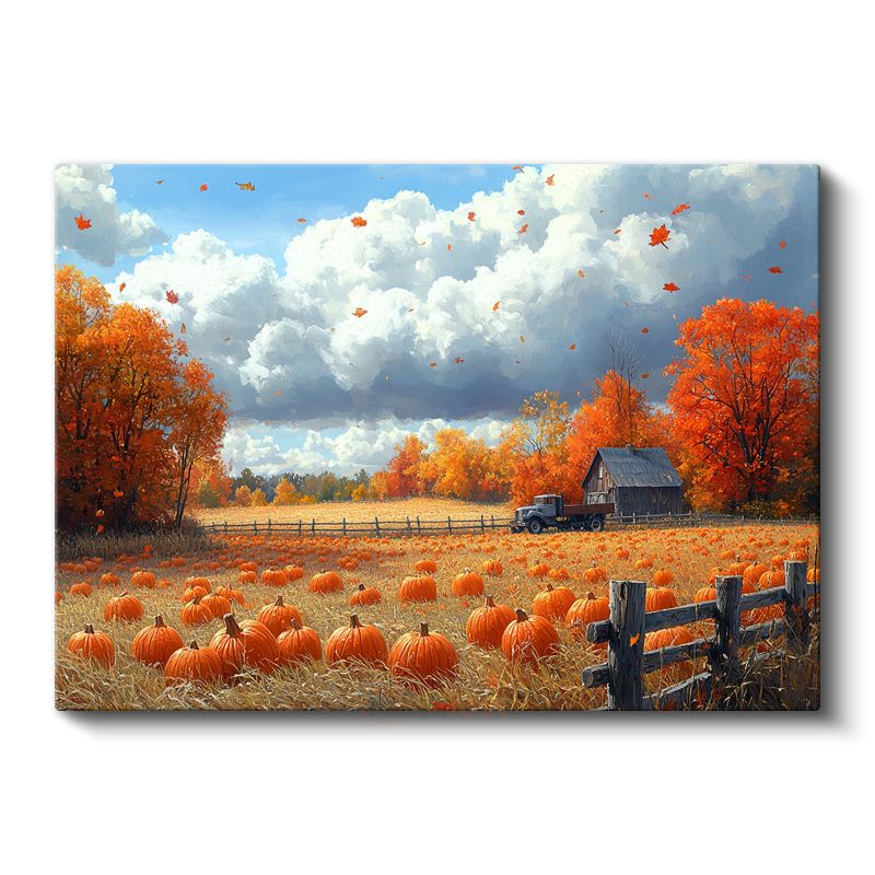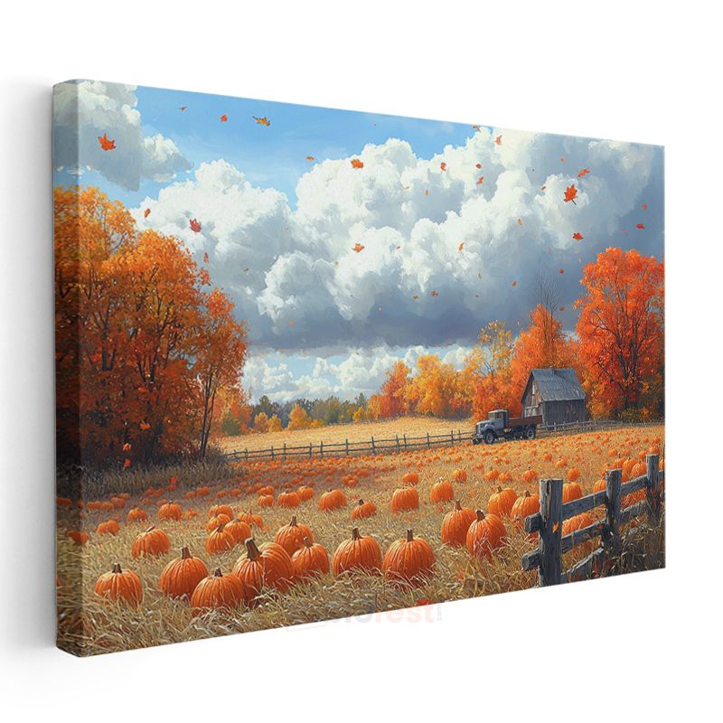 Sonbahar Çiftliği - Balkabağı Hasadı ve Turuncu Yapraklar Kanvas Tablo