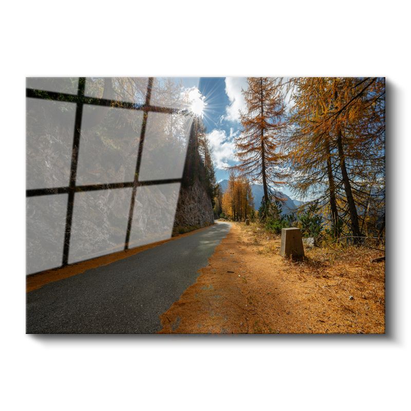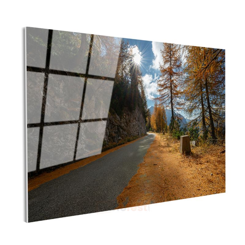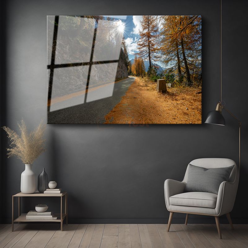 Sonbahar Dağ Yolu - Güneş Işınları Altında Altın Renkli Orman Cam Tablo