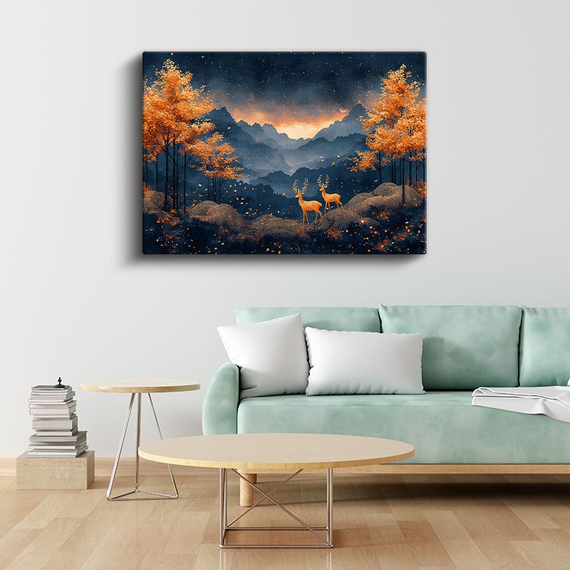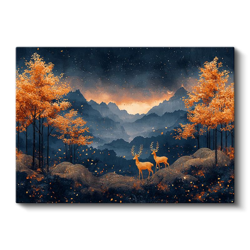 Sonbahar Geyikleri - Turuncu Yapraklar Arasında İkili Kanvas Tablo