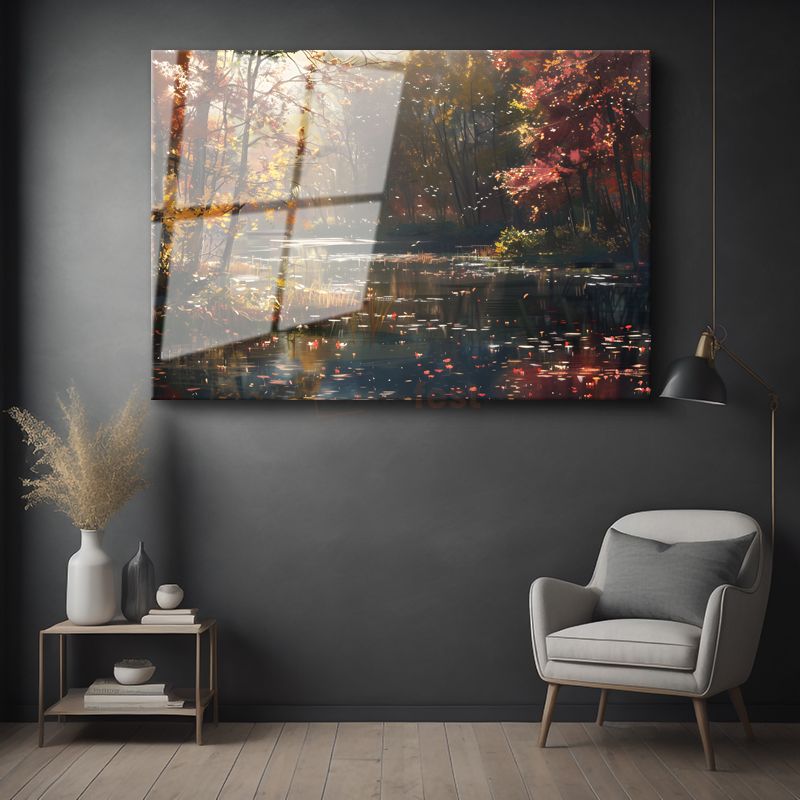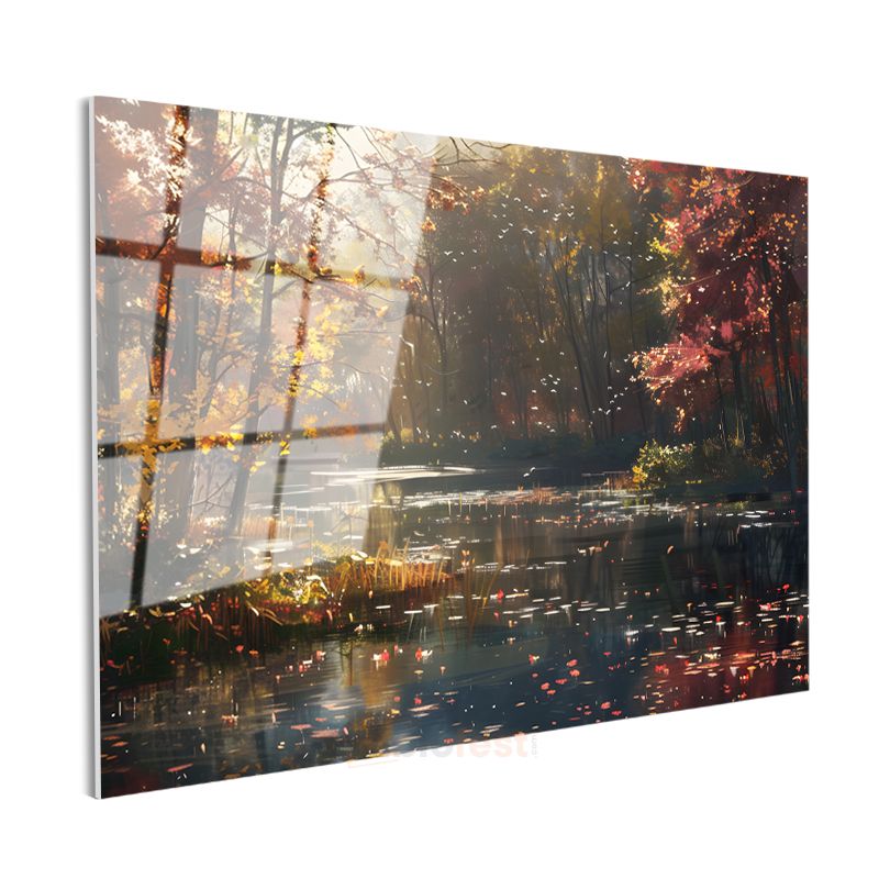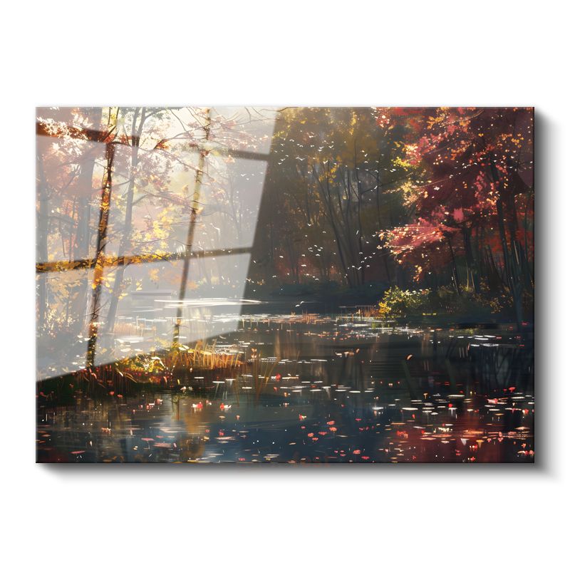 Sonbahar Göl - Altın Yapraklar Arasında Güneş Işıltıları Cam Tablo
