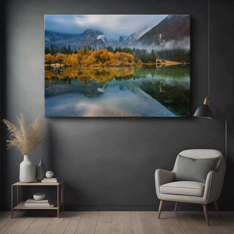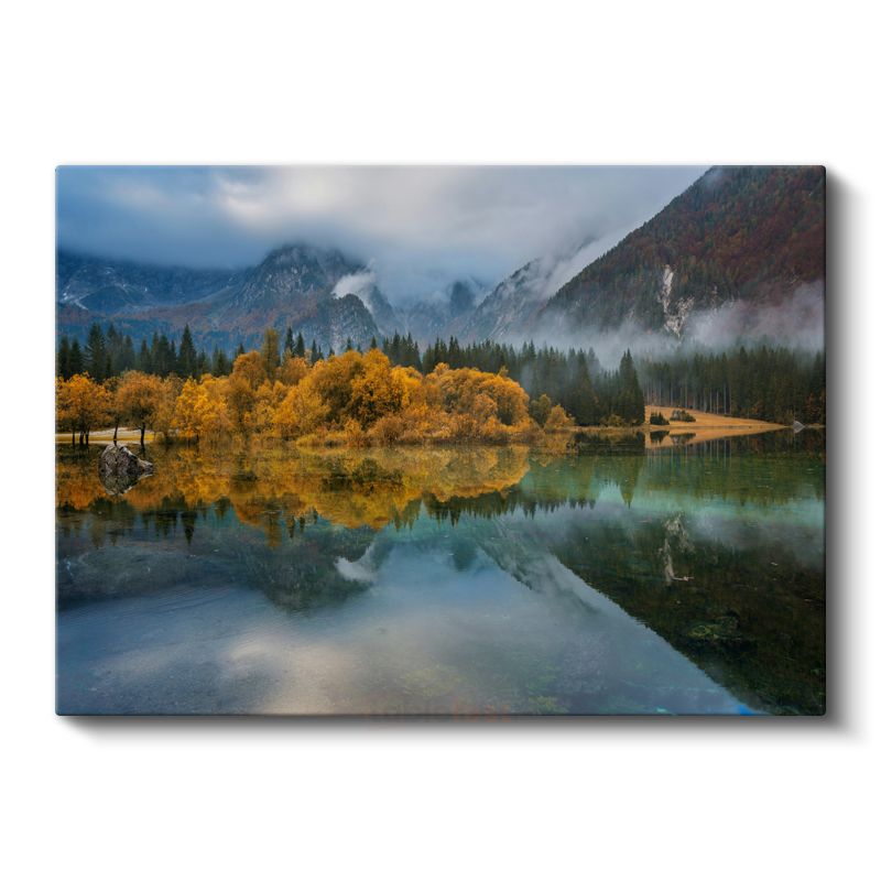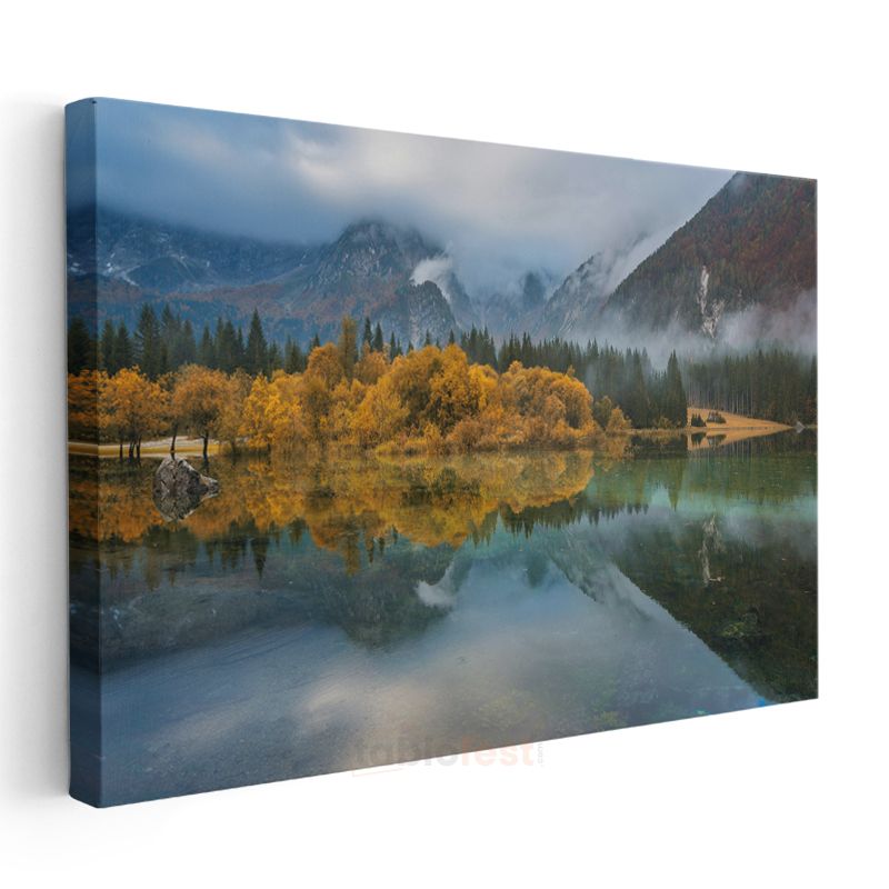 Sonbahar Gölü - Sisli Dağlar ve Altın Yapraklar Kanvas Tablo