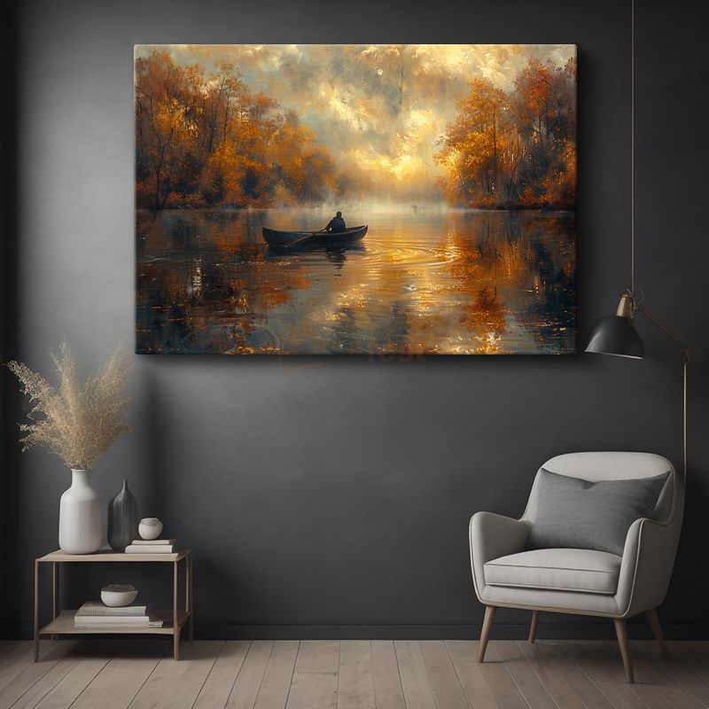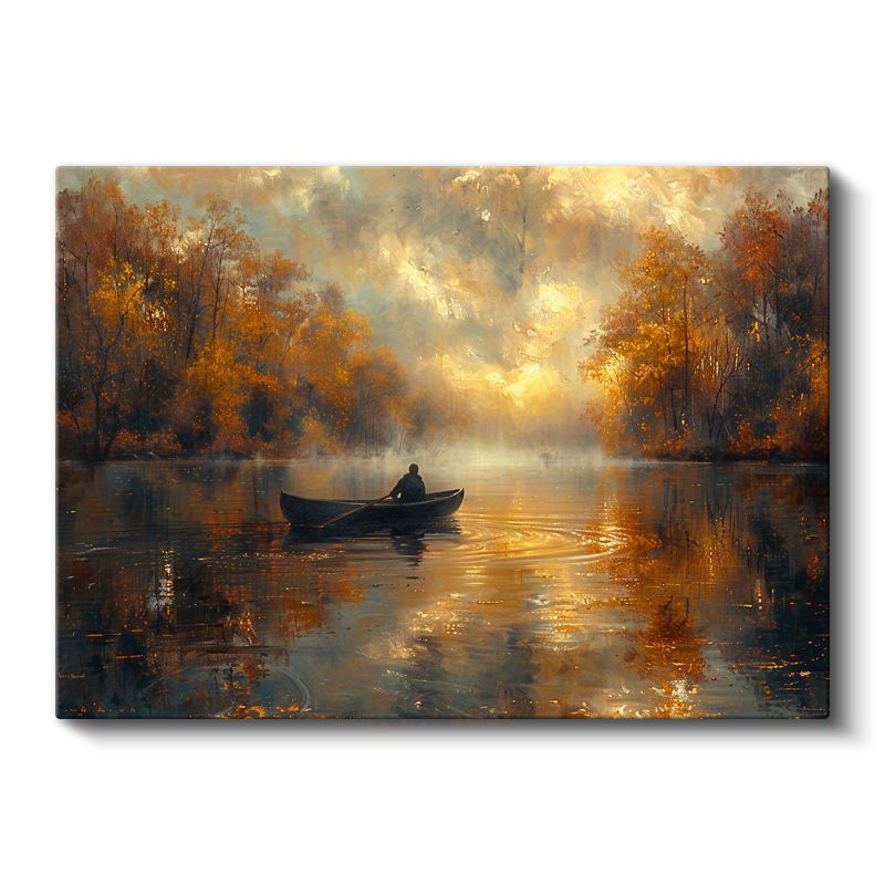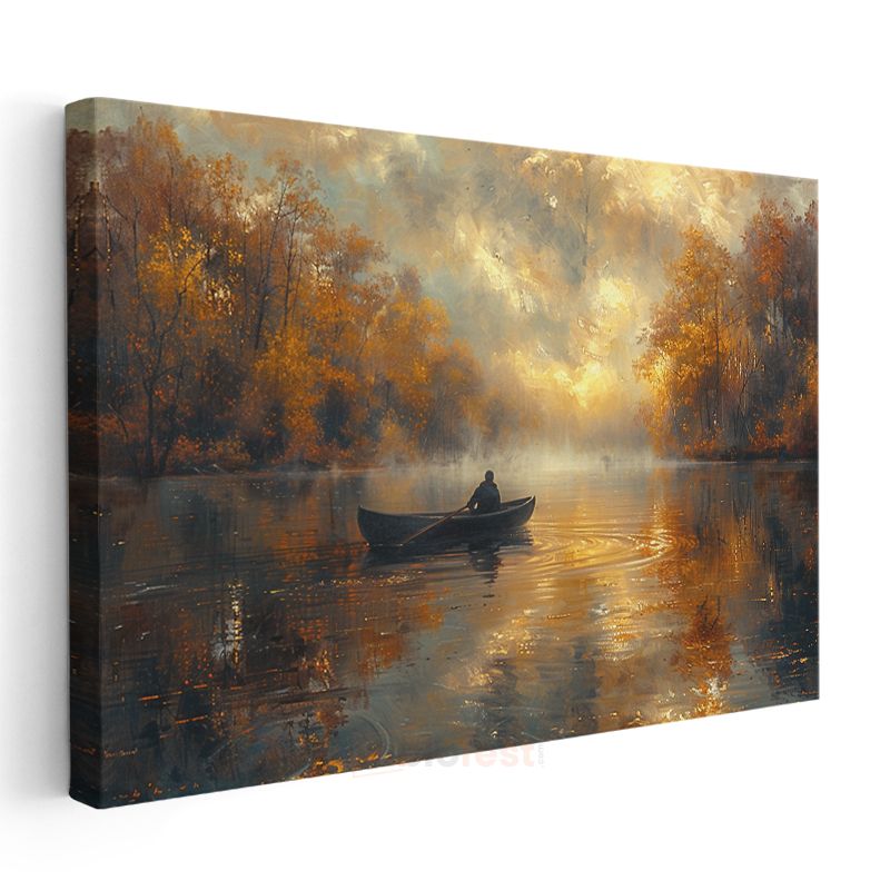 Sonbahar Gölü - Sisli Kayık Yolculuğu Kanvas Tablo