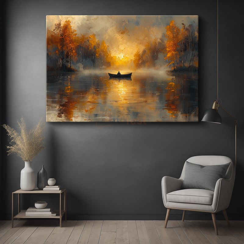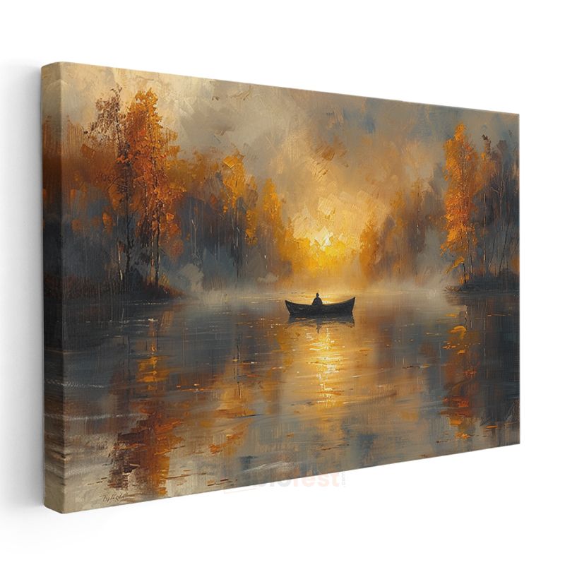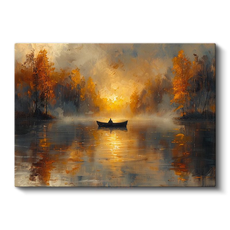 Sonbahar Gölü - Sisli Suda Yalnız Kayık ve Altın Orman Kanvas Tablo