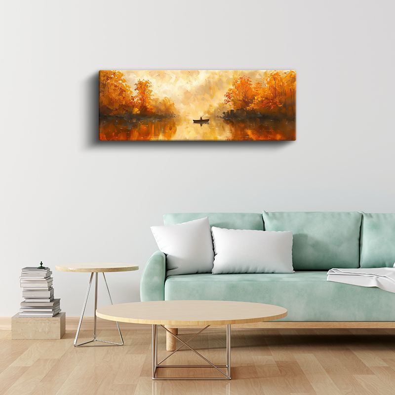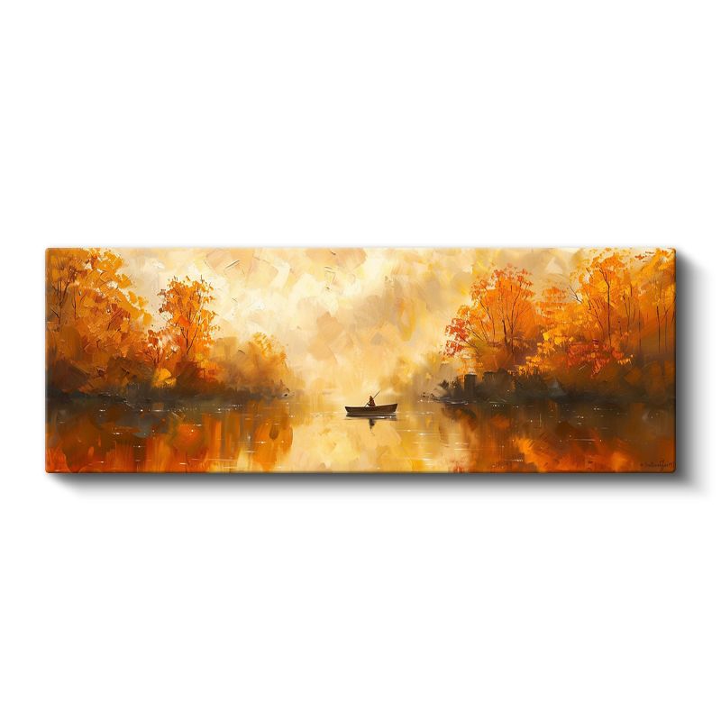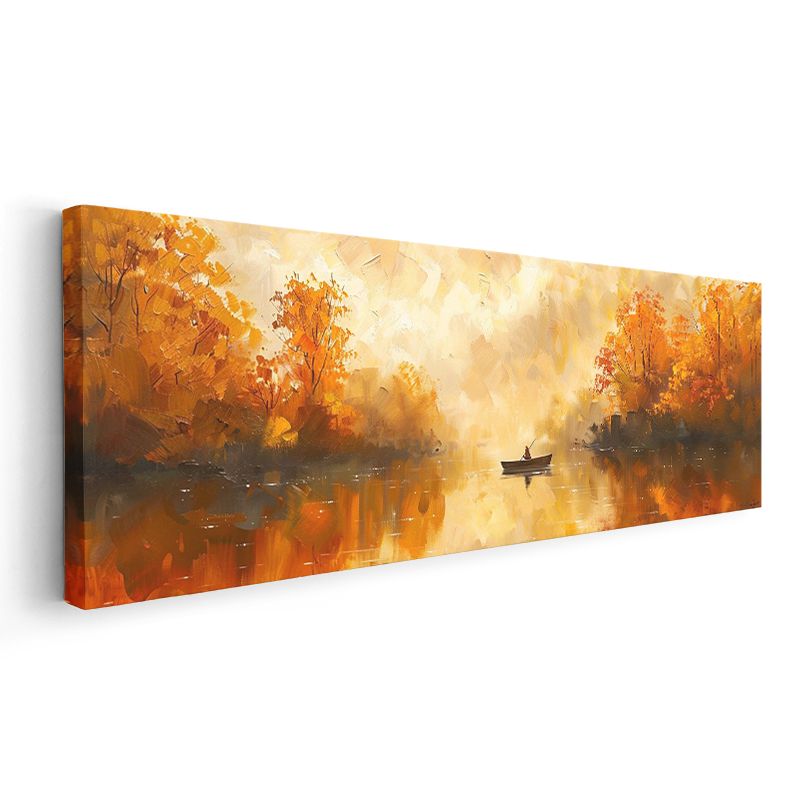 Sonbahar Gölü - Turuncu Yapraklar Arasında Yalnız Kayık Kanvas Tablo