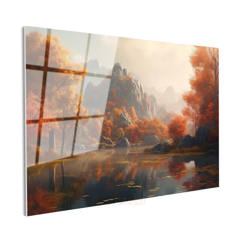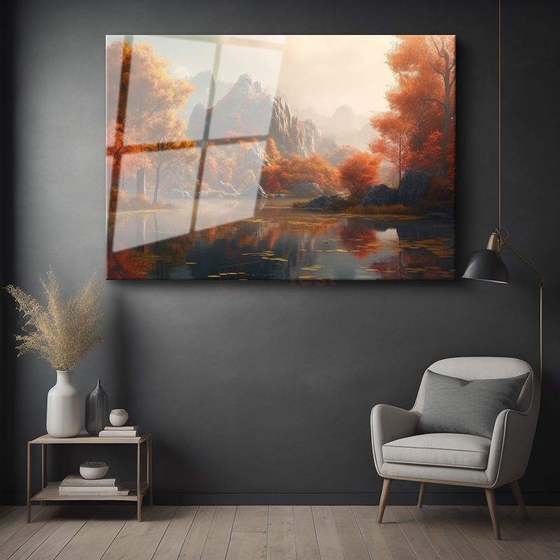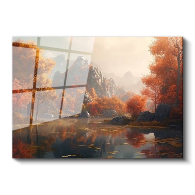 Sonbahar Gölü - Turuncu Yaprakların Dansı Cam Tablo