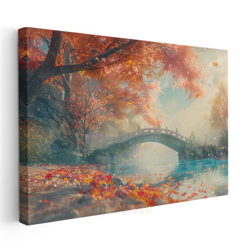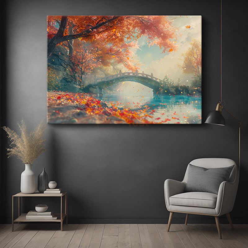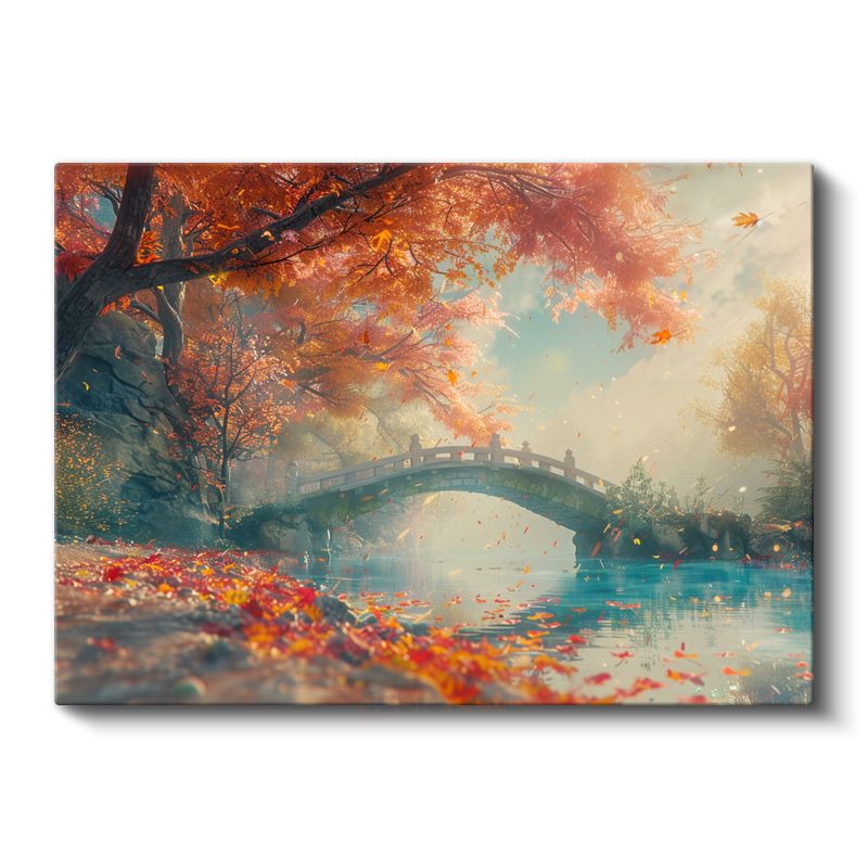 Sonbahar Köprüsü - Kızıl Yapraklar ve Durgun Göl Kanvas Tablo